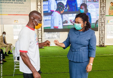 Dr Veronique TOGNIFODE, the Ministry of Social Affairs and Microfinance handing a health insurance card to a newly enrolled beneficiary of the ARCH’s Health Insurance component during the launching ceremony of the extension of the program on January 2021.