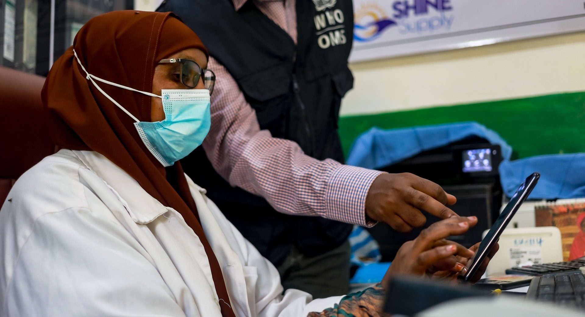 Health worker using an electronic surveillance system in a health facility, Mogadishu, Somalia, 2021.
