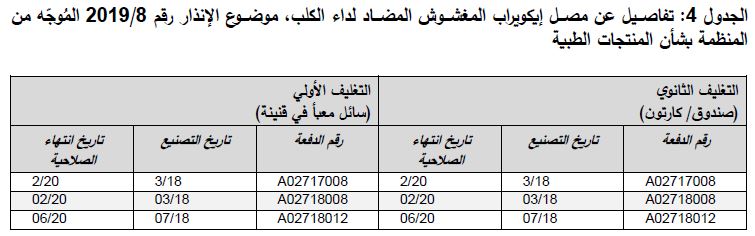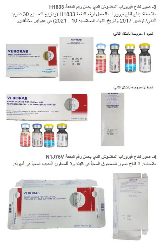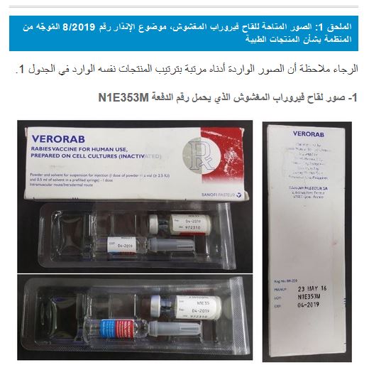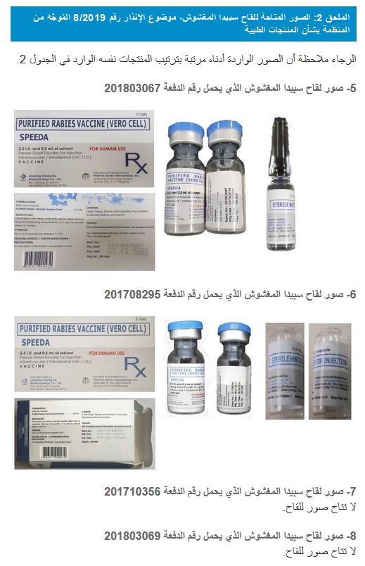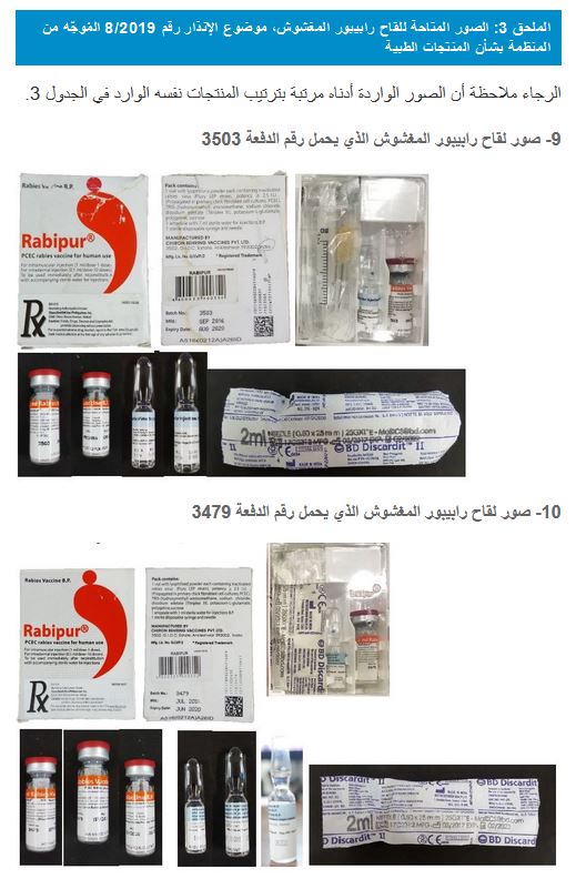 يتعلق هذا الإنذار المُوجّه بشأن المنتجات الطبية بثلاثة لقاحات مغشوشة مضادة لداء الكلب (فيروراب وسبيدا ورابيبور) (Verorab, Speeda, and Rabipur) ومصل (إيكويراب) (Equirab) المغشوش المضاد للداء والمتداولة جميعها بالفلبين. ويرتبط هذا الإنذار بالإنذار رقم 1/2019 بشأن المنتجات الطبية الصادر يوم 30 كانون الثاني/ يناير 2019 فيما يخص تداول لقاحات فيروراب المغشوشة بالفلبين. وداء الكلب مرض فيروسي يمكن الوقاية منه باللقاحات وهو قاتل دوماً في معظم الحالات عقب ظهور أعراض الإصابة به سريرياً، ومنتشر بأنحاء العالم كافّة، ولكّن إقليمي آسيا وأفريقيا يستأثران بنسبة تزيد على 95٪ من الوفيات الناجمة عنه بين صفوف البشر. وتستعمل لقاحات فيروراب وسبيدا ورابيبور الأصلية لأغراض التطعيم السابق للتعرض لداء الكلب أو للوقاية منه عقب التعرض له، أمّا مصل إيكويراب الأصلي المضاد لداء الكلب فهو مصل يوفر مناعة معطلة مضادة للداء.