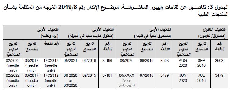 كُشِف النقاب حتى الآن عن إصدارات مغشوشة لتوليفتين مختلفتين من أرقام دُفعات المنتج الذي ترد تفاصيل عنه في الجدول 3 أدناه، وكذلك في التقرير الاستشاري رقم 2019-170 الصادر عن إدارة الأغذية والأدوية في الفلبين. ويُرجى الرجوع إلى الملحق 3 من أجل الاطلاع على الصور المتاحة عن المنتج.