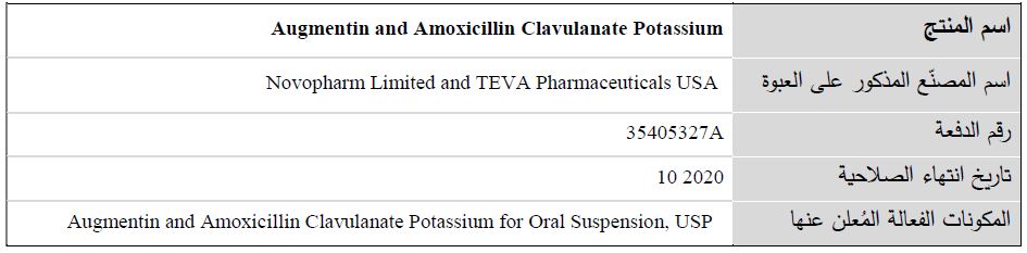 منتج الأوغمنتين وأموكسيسيلين كلافولونات البوتاسيوم الحامل لرقم الدفعة 35405327A