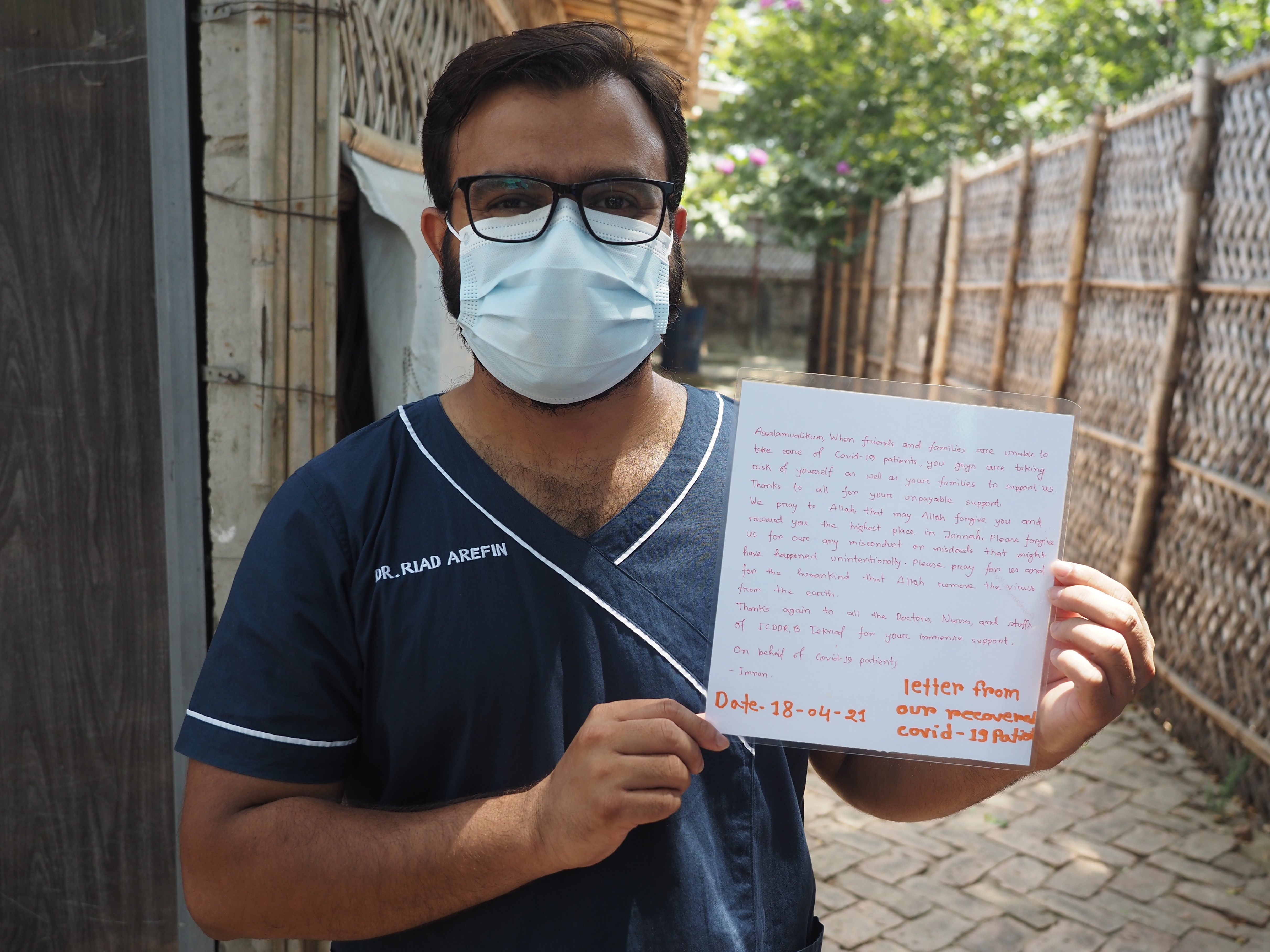 Dr Md Riad Arefin and his dedicated colleagues received a letter of appreciation from a discharged COVID-19 patient acknowledging the great work and personal treatment received by each of the healthcare workers at the SARI ITC. WHO Bangladesh/ Irene Gavieiro Agud