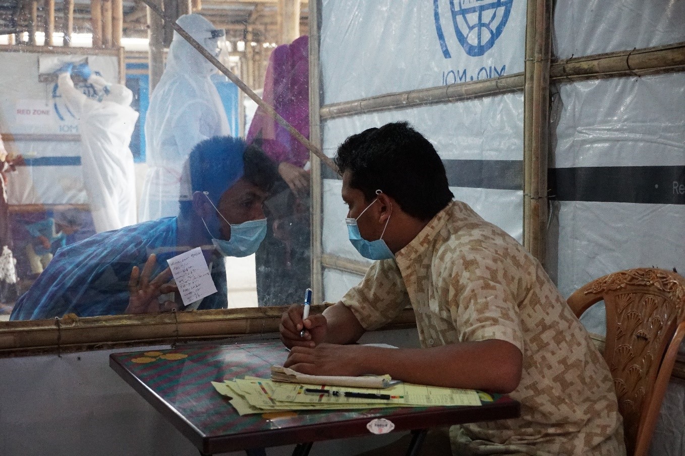 A Rohingya patient explaining his symptoms to a Medical Officer at an IOM severe acute respiratory infection (SARI) isolation and treatment center. To prevent the risk of COVID-19 transmission, patients and health staff are separated by a window shield. WHO Bangladesh/Tatiana Almeida