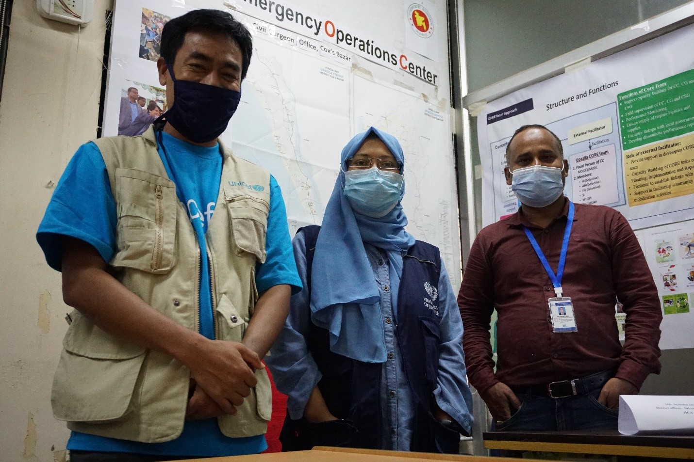 When COVID-19 hit globally, in Bangladesh and in Cox’s Bazar, the HEOC/ Control Room at the Civil Surgeon Office (CSO) was promptly activated for Emergency Level 2 to serve as a coordination platform and information hub for ongoing COVID-19 surveillance and subsequent awareness in the district while providing guidance as different partners and stakeholders work towards addressing the emergent needs of the district’s vulnerable populations, including Rohingya refugees and nearby host communities.