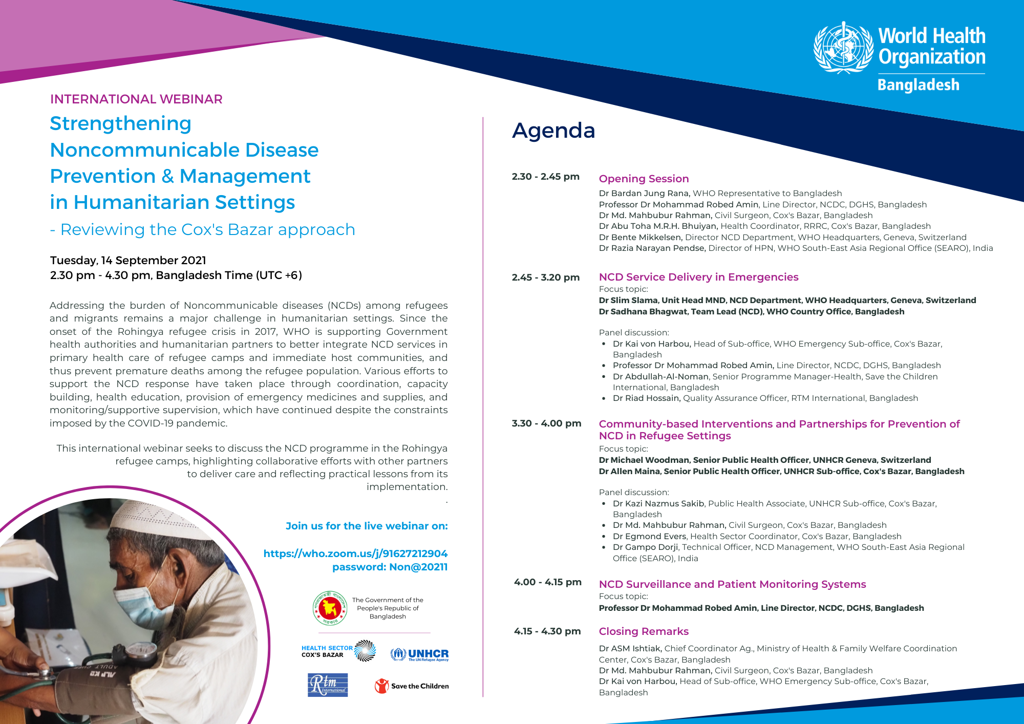 This international webinar seeks to discuss the NCD programme in the Rohingya refugee camps, highlighting collaborative efforts with partners to deliver care and reflecting practical lessons from its implementation.