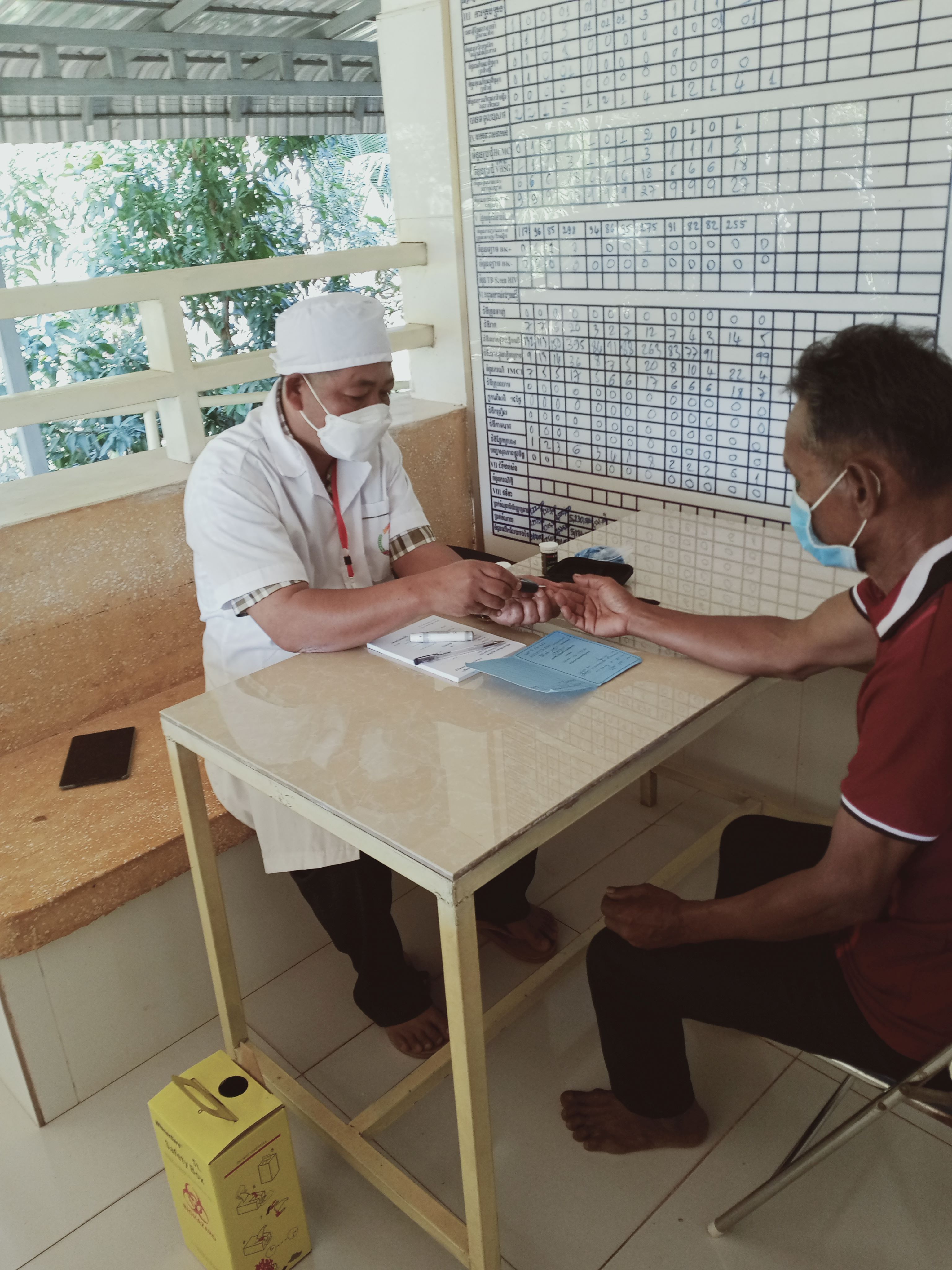 Thnorng Health Center in Kampot Operational District, Kampot province conducted a screening of diabetes for Mr Soeun, a hypertension patient during medical consultation.