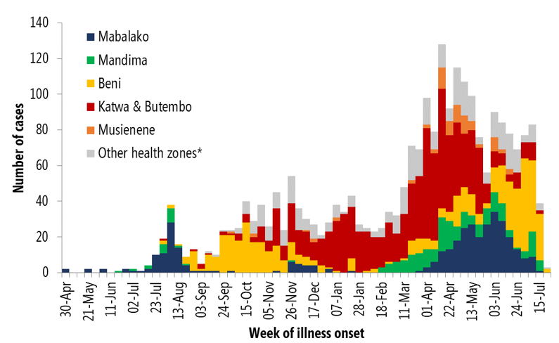 *Data in recent weeks are subject to delays in case confirmation and reporting, as well as ongoing data cleaning. Other health zones include: Alimbongo, Ariwara, Biena, Bunia, Goma, Kalunguta, Kayna, Komanda, Kyondo, Lubero, Mangurujipa, Masereka, Mutwanga, Nyankunde, Oicha, Rwampara and Tchomia.
