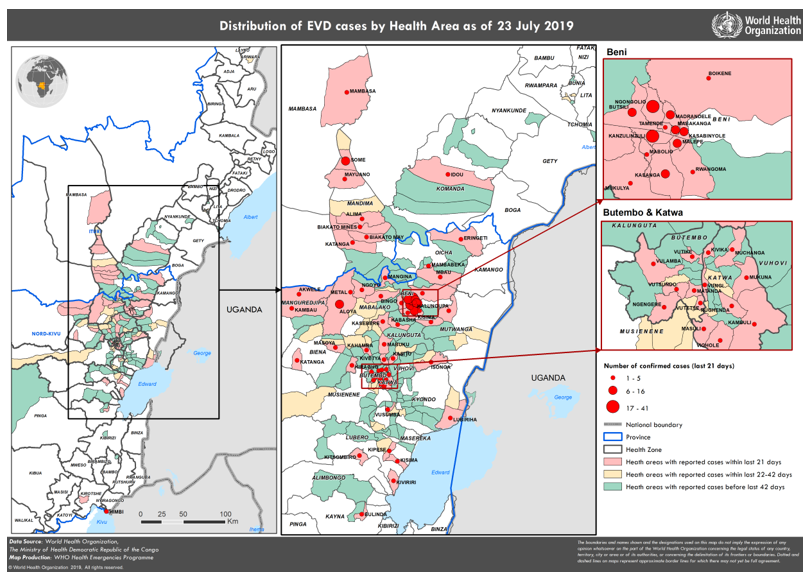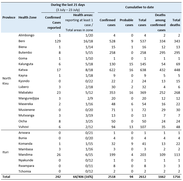 In the 21 days from 3 July through 23 July 2019, 64 health areas within 18 health zones reported new cases, representing 10% of the 664 health areas within North Kivu and Ituri provinces (Figure 2). During this period, a total of 242 confirmed cases were reported, the majority of which were from the health zones of Beni (53%, n=129), Mandima (11%, n=26), Mabalako (10%, n=23), and Katwa (7%, n=17) (Table 1). As of 23 July 2019, a total of 2612 EVD cases were reported, including 2518 confirmed and 94 probable cases, of which 1756 cases died (overall case fatality ratio 67%). Of the total confirmed and probable cases, 56% (1470) were female, and 29% (744) were children aged less than 18 years. Bunia, Kyondo and Musienene health zones all recently cleared 21 days since their last reported case. However, high risks remain for the virus to be reintroduced to these areas, requiring teams to remain fully resourced and vigilant.