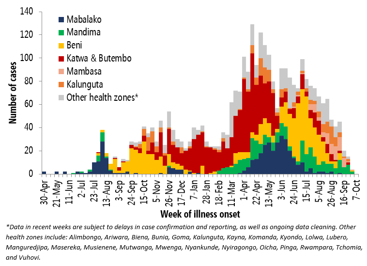 *Data in recent weeks are subject to delays in case confirmation and reporting, as well as ongoing data cleaning. Other health zones include: Alimbongo, Ariwara, Biena, Bunia, Goma, Kalunguta, Kayna, Komanda, Kyondo, Lolwa, Lubero, Manguredjipa, Masereka, Musienene, Mutwanga, Mwenga, Nyankunde, Nyiragongo, Oicha, Pinga, Rwampara, Tchomia, and Vuhovi.