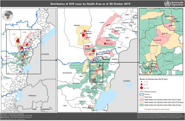 In mid-September, serious security incidents in Lwemba Health Area, Mandima Health Zone, stalled outbreak response activities for more than two weeks. To improve confidence and community engagement in response activities, an open forum for discussion and reconciliation was held in Lwemba with partners and civil society last week. Response activities have since resumed but remain limited. Improved access may result in enhanced case finding and contact tracing therefore could result in an increase in the number of reported cases and contacts in the area.