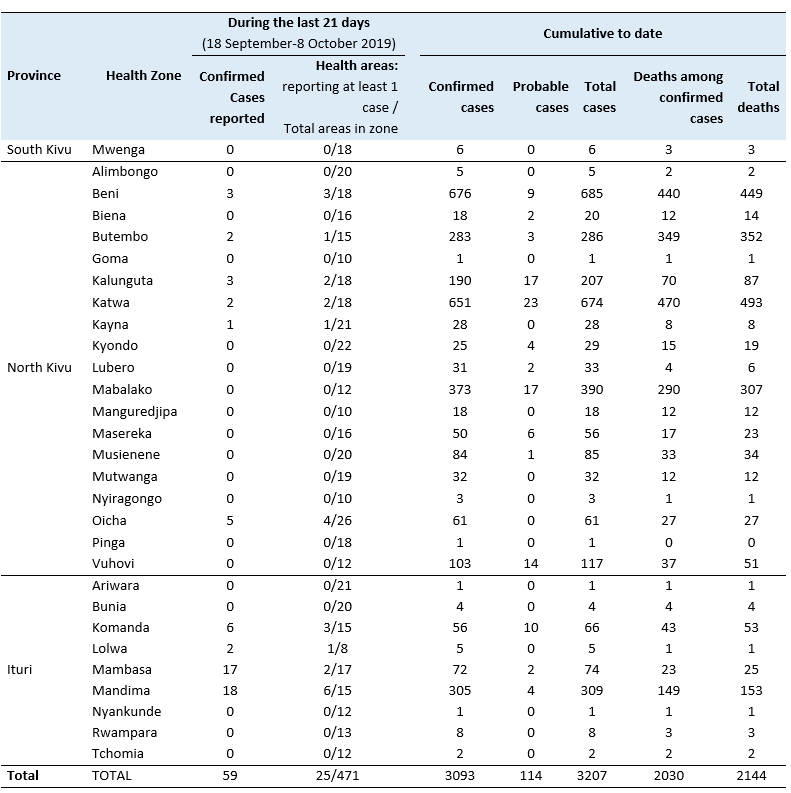 As of 8 October, a total of 3207 EVD cases were reported, including 3093 confirmed and 114 probable cases, of which 2144 cases died (overall case fatality ratio 67%). Of the total confirmed and probable cases, 59% (n=1797) were female, 31% (n=909) were children aged less than 18 years, and 5% (n=162) were health workers.