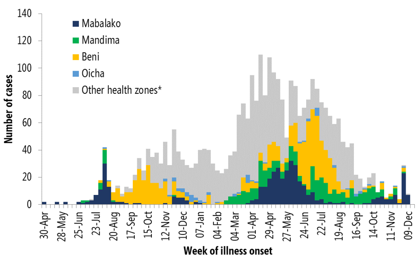 Figure 1: Confirmed and probable Ebola virus disease cases by week of illness onset by health zone. Data as of 17 December 2019*