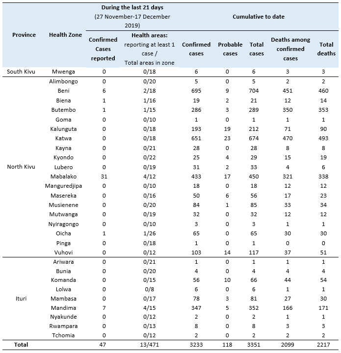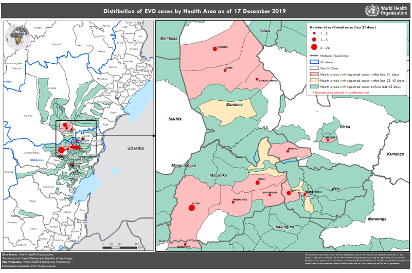 Eleven new confirmed cases were reported from 11 to 17 December in the ongoing Ebola virus disease (EVD) outbreak in North Kivu and Ituri provinces. The confirmed cases in this week were reported from three health areas in three health zones: Mabalako (82%, n=9), Biena (9%, n=1), and Butembo (9%, n=1). This is the first confirmed case in Butembo Health Zone in 54 days.