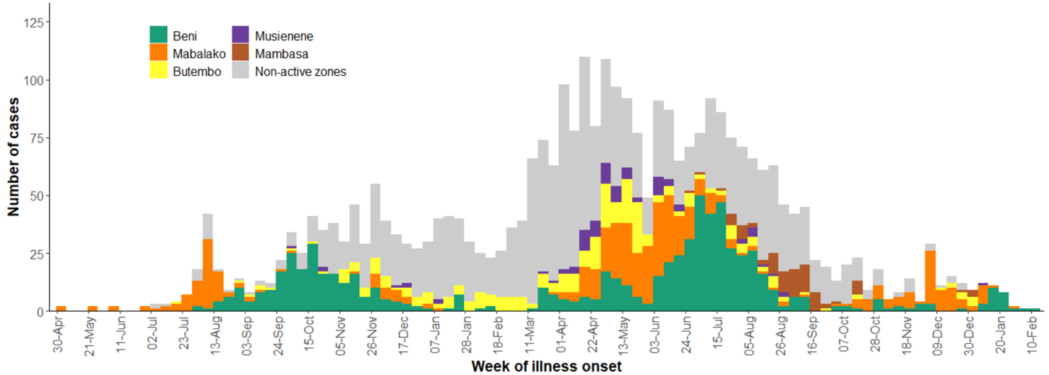 This week, the case incidence continued to be low in the Ebola virus disease (EVD) outbreak in the Democratic Republic of the Congo (Figure 1). From 5 to 11 February, three new confirmed cases were reported in Beni Health Zone, North Kivu Province. All three cases have epidemiological links to a transmission chain originating in Aloya Health Area, Mabalako Health Zone, with possible nosocomial exposure in Beni. The most recent case reported from Beni Health Zone on 11 February was isolated one day after symptom onset. Early detection of cases reduces the probability of transmission of EVD in the community and significantly improves the clinical outcome for the patients.