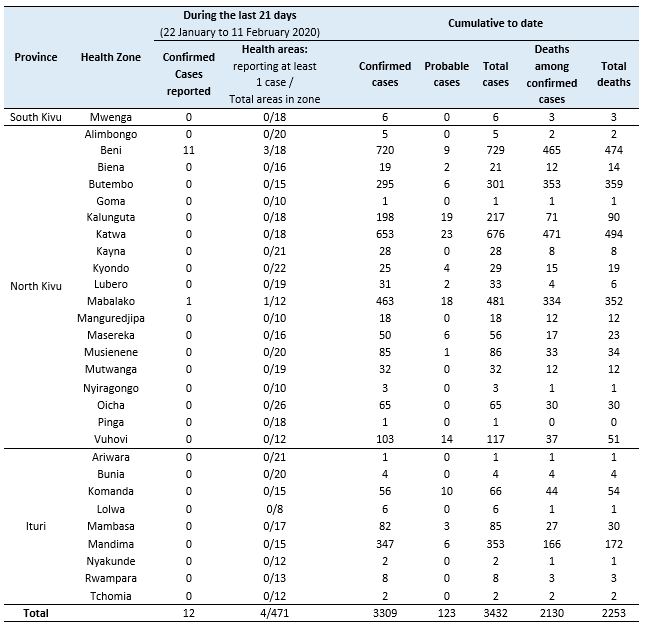 Table 1: Confirmed and probable Ebola virus disease cases, and number of health areas affected, by health zone, North Kivu Province, Democratic Republic of the Congo, data as of 11 February 2020**