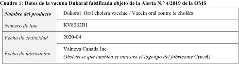 Esta Alerta sobre Productos Médicos hace referencia a la circulación en la Región de Asia Sudoriental de la OMS de vacunas DUKORAL cuya falsificación está confirmada.. La vacuna Dukoral genuina es una vacuna oral contra el cólera que está precalificada por la OMS.