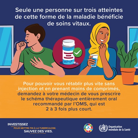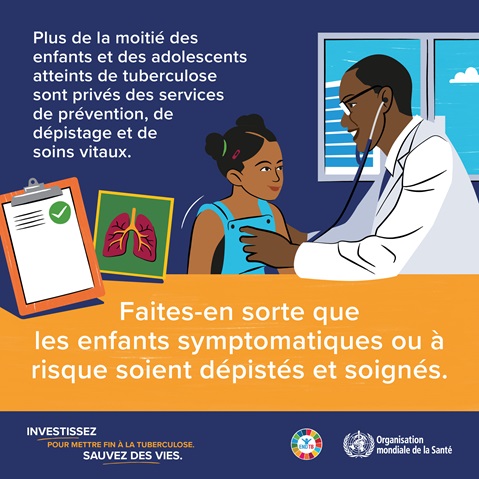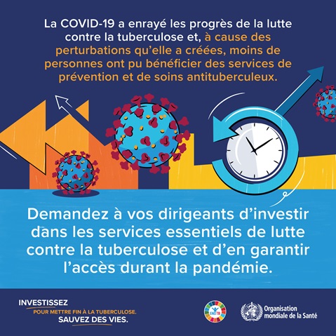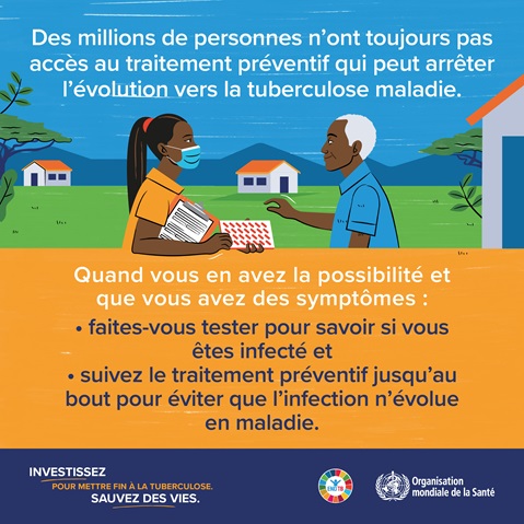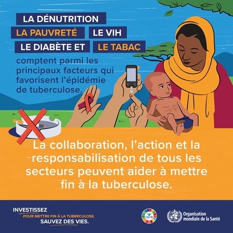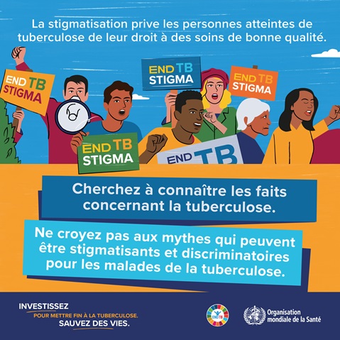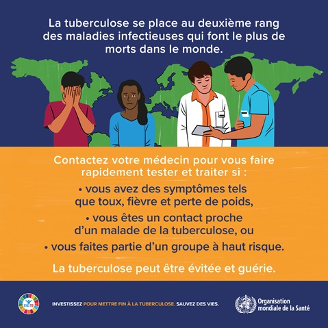 Chaque année, le 24 mars, nous commémorons la Journée mondiale de lutte contre la tuberculose afin de sensibiliser le public aux conséquences sanitaires, sociales et économiques dévastatrices de cette maladie et d’intensifier l’action pour mettre fin à l’épidémie mondiale de tuberculose. Vous aussi, vous avez un rôle à jouer ! Diffusez ces supports de campagne sur les médias sociaux pour sensibiliser et soutenir la campagne.