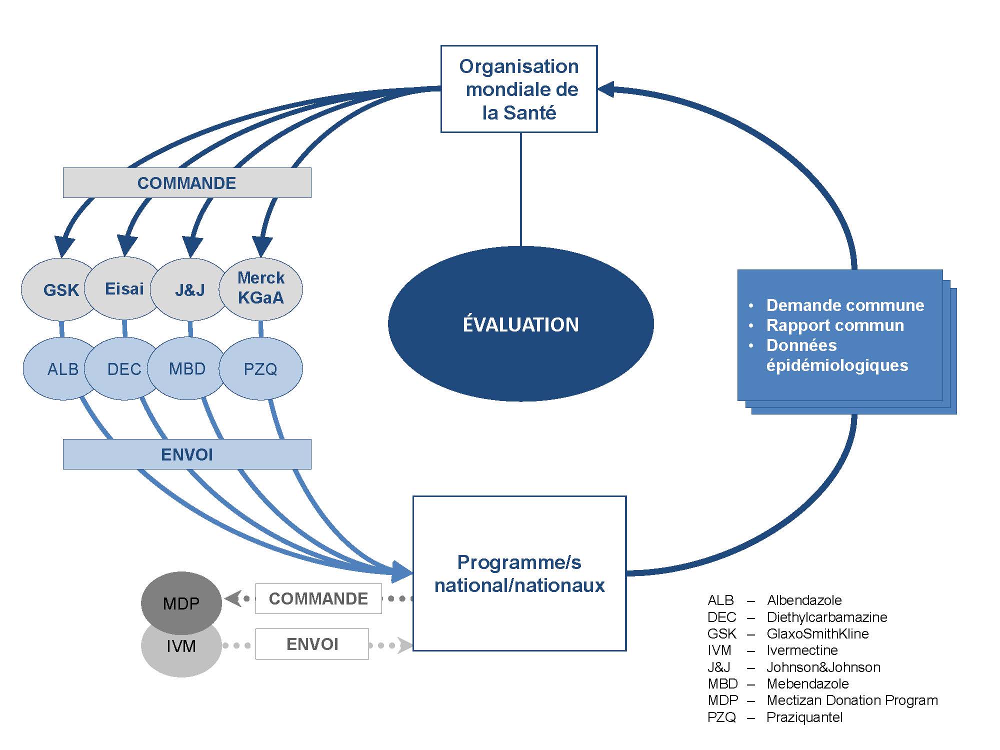 Dans le cadre des efforts mondiaux visant à accélérer l'expansion de la chimioprévention pour l'élimination et le contrôle de la filariose lymphatique (FL), la schistosomiase (SCH) et les géohelminthiases (STH), l'OMS facilite l'approvisionnement des médicaments suivants, offerts par l'industrie pharmaceutique : diethylcarbamazine, albendazole, mébendazole et praziquantel. L'OMS contribue également à fournir de l'ivermectine pour l'onchocercose (ONCHO) et les programmes d'élimination de la filariose lymphatique.