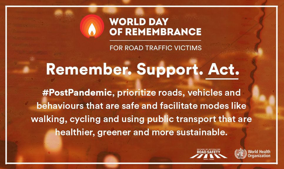 The World Day of Remembrance for Road Traffic Victims was started by RoadPeace in 1993. In 2005, the United Nations endorsed it as a global day to be observed every third Sunday in November each year, as the “appropriate acknowledgement for victims of road traffic injuries and their families”. Since then the World Day of Remembrance has been observed and promoted worldwide by many governments, international agencies and groups such as the European Federation of Road Traffic Victims (FEVR), the International Road Victims’ Partnership (IRVP) and the Global Alliance of NGOs for Road Safety and their associated members. WHO and the United Nations Road Safety Collaboration encourage all road safety stakeholders to commemorate the World Day of Remembrance to pay homage to those who have died on the world’s roads, advocate for better support for victims and bereaved families and promote action to save lives.