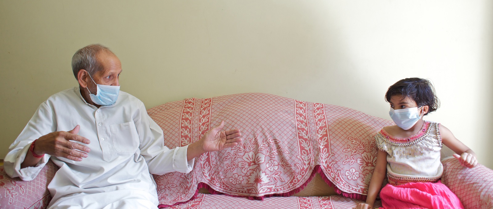 A man and his granddaughter wear face masks while sitting a distance apart from each other in a middle class household of north Delhi.