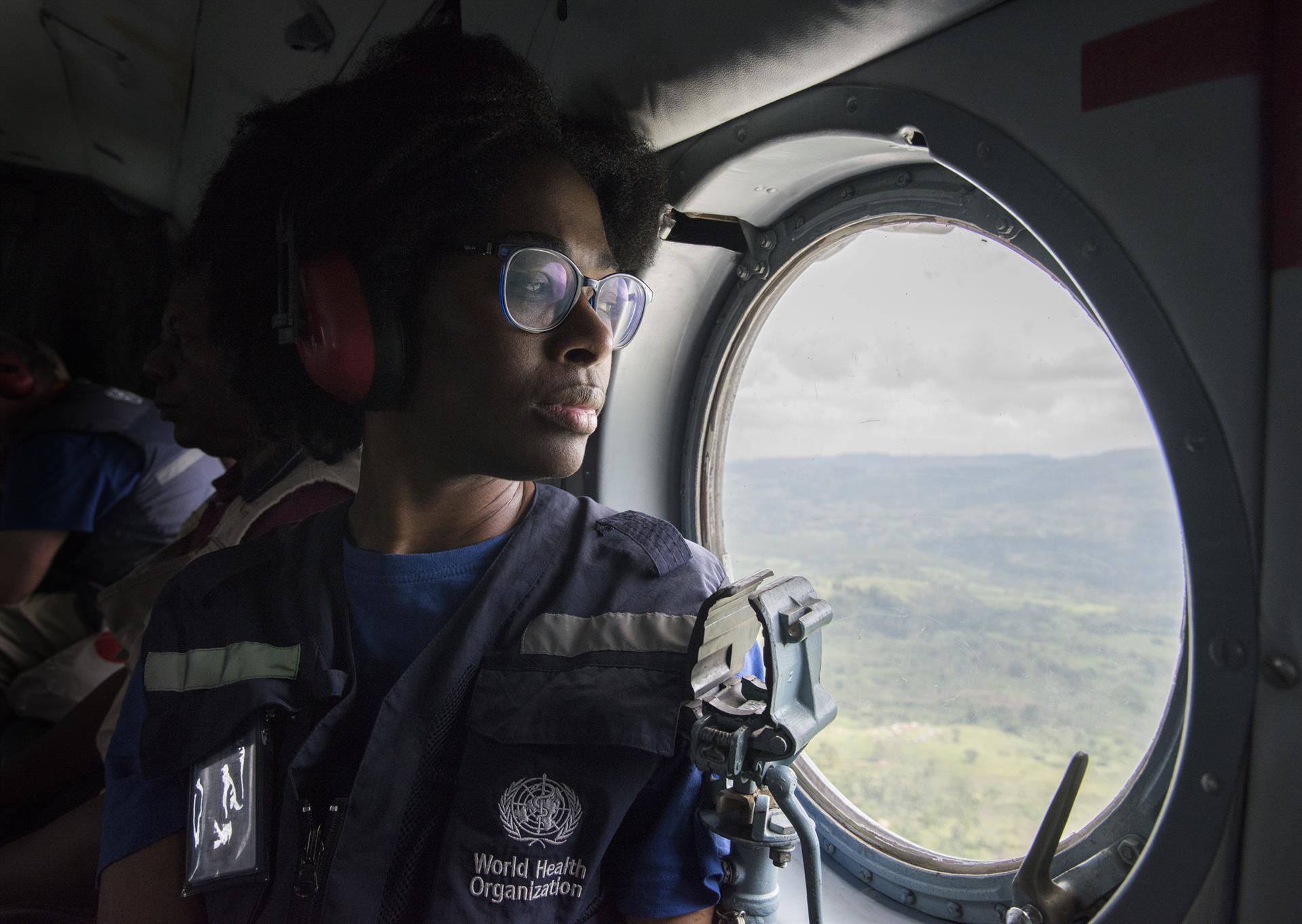 World Health Organization (WHO) epidemiologist Marie-Roseline Darnycka Bélizaire on a MONUSCO helicopter flight between Beni and Butembo in the Democratic Republic of the Congo (DRC) on 1 January 2019.