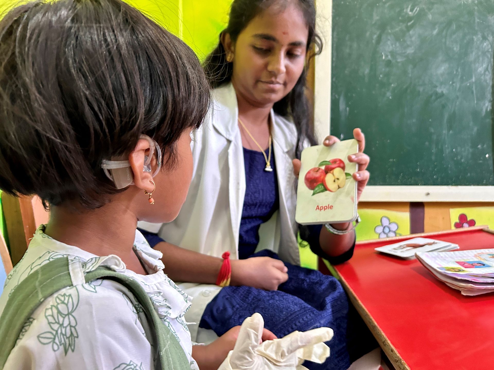 A pre-schooler with hearing impairment undergoing speech and listening therapy. Over 1.5 billion people live with ear problems and hearing loss globally; another one billion are at risk of hearing loss from unsafe listening practices. (Photo: © WHO India / Anshu Shekhar Roy)