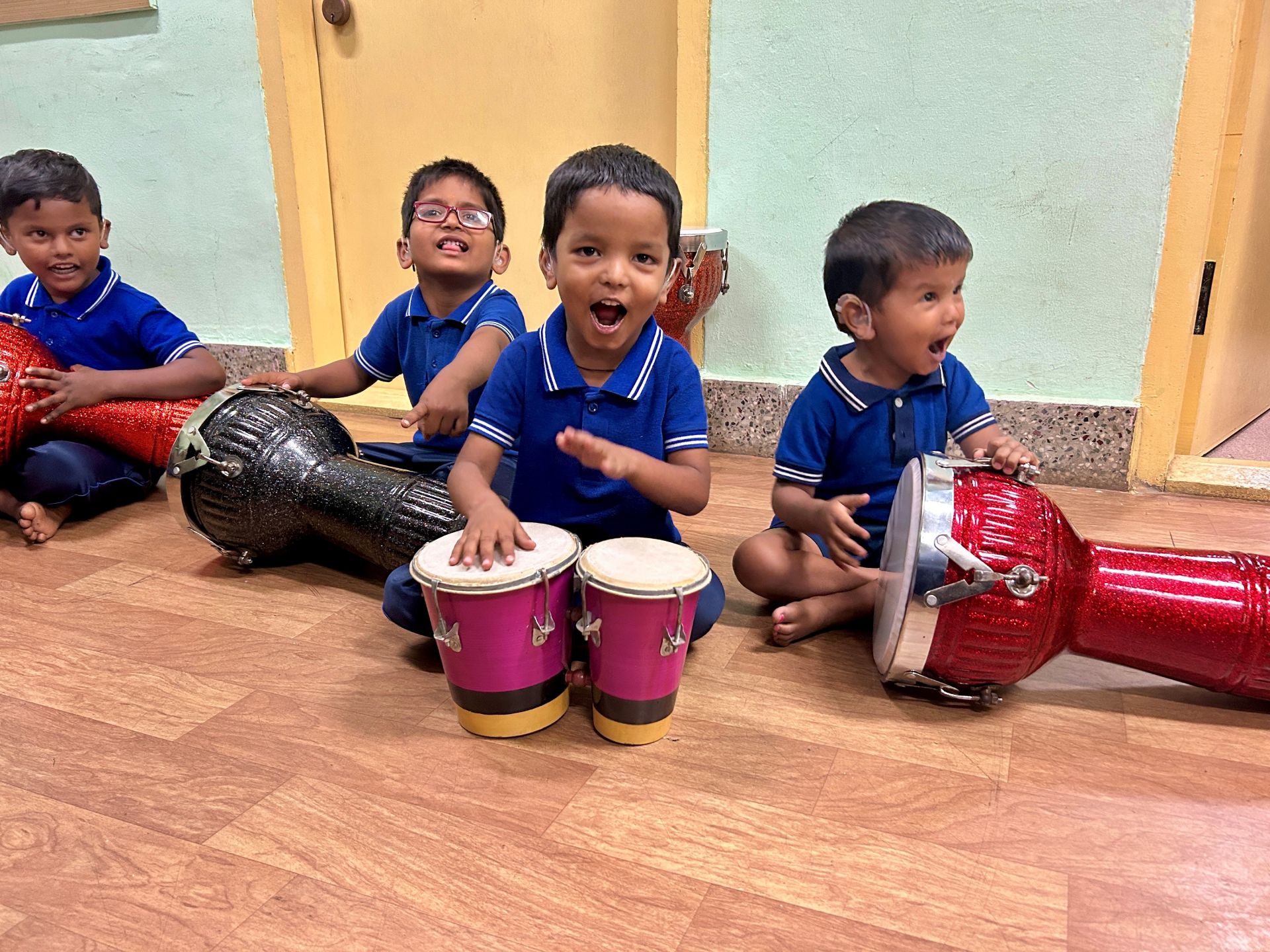 Creative expression through music for the holistic development of children with communication disorders is part of the Special Use of Music for Educational Readiness and Upbuilding (SUMERU) initiative of the Department of Special Education, All India Institute of Speech and Hearing in Mysuru, Karnataka. (Photo: © WHO India / Anshu Shekhar Roy)