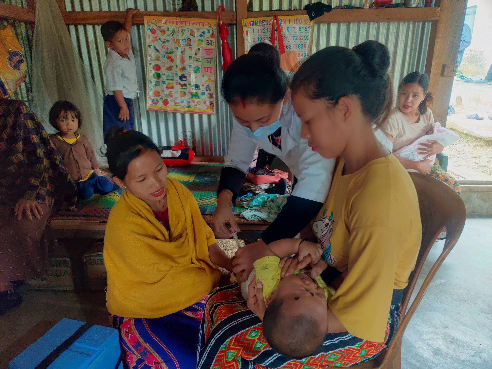 An auxiliary nurse midwife from Community Health Centre Kanubari, Longding district, Arunachal Pradesh, vaccinates a baby in a makeshift immunization clinic for women and children in the hard-to-reach Chopnu village in Tirap district, Arunachal Pradesh. WHO National Public Health Support Network (NPSN) provides technical and monitoring support to strengthen routine immunization and vaccine-preventable diseases to the Government of India with special focus on strengthening services in hard-to-reach areas. (Photo: © WHO India / Sanchita Sharma)