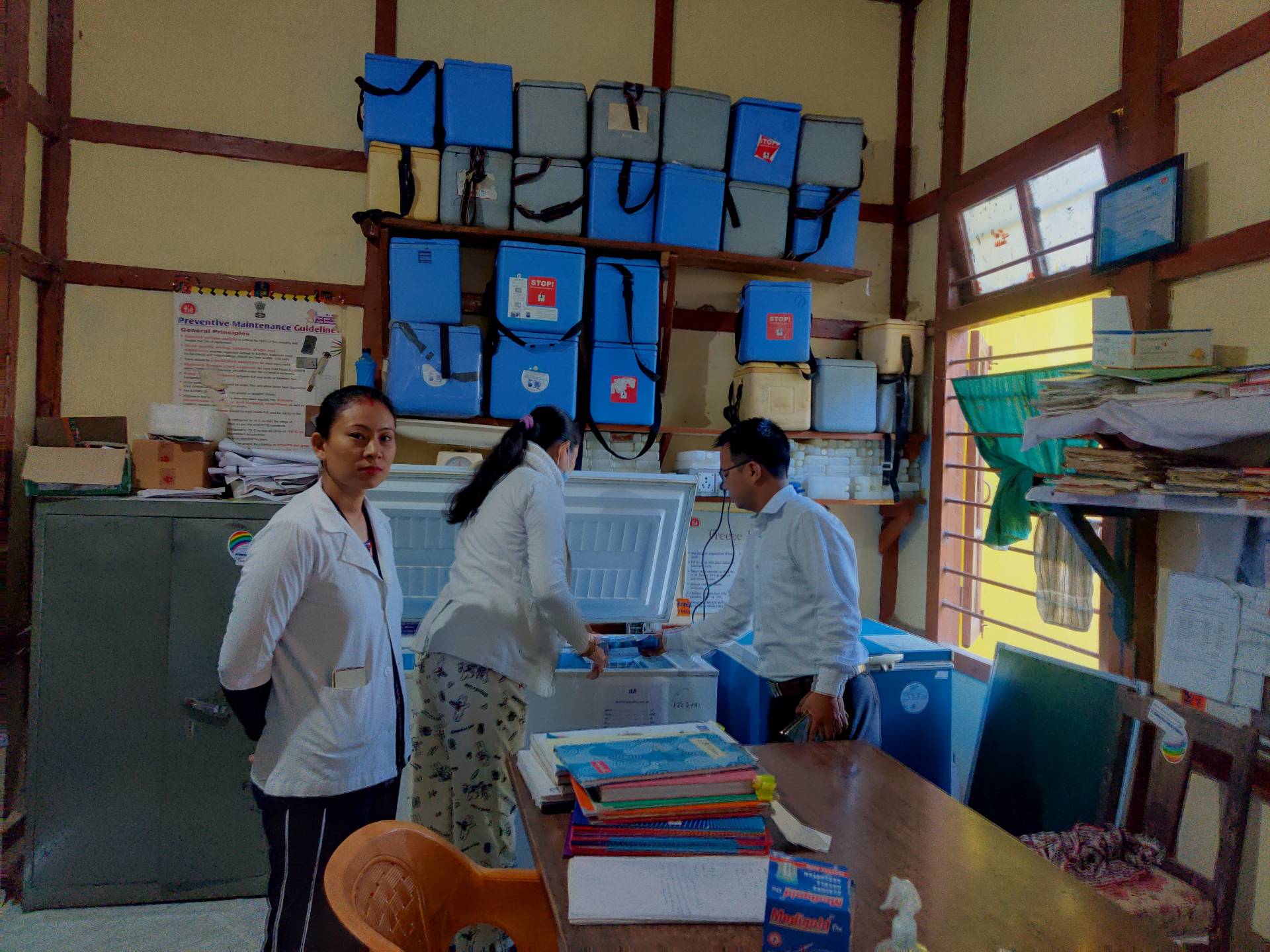 A routine immunization orientation and microplan review workshop was held at Gabil Primary Health Centre, Resubelpara block, North Garo Hills, to train the medical officer, supervisor, and newly-posted auxiliary nurse midwives with support from WHO field teams. The centre serves 6105 people across 21 villages, 16 of which are high-risk due to poor connectivity. The training aims to strengthen capacity and ensure every child in these hard-to-reach areas receives timely immunization. (Photo: © WHO India / Binku Moron)