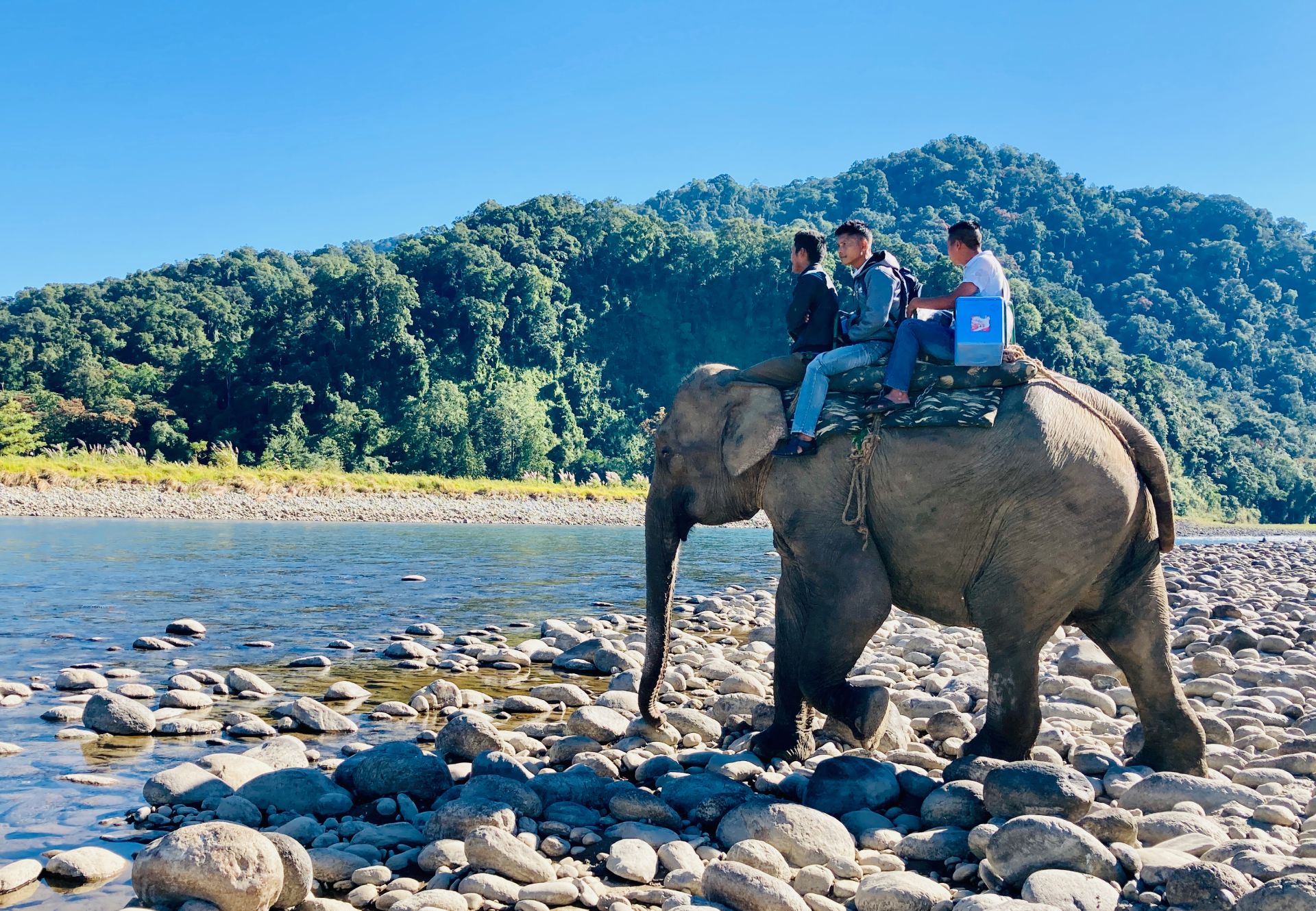 Lakhi, mother of two healthy elephants, carries lifesaving vaccines across the Noa-Dihing river to protect human children in Deban village in the Changlang district of Arunachal Pradesh. (Photo: Sanchita Sharma / © WHO India)