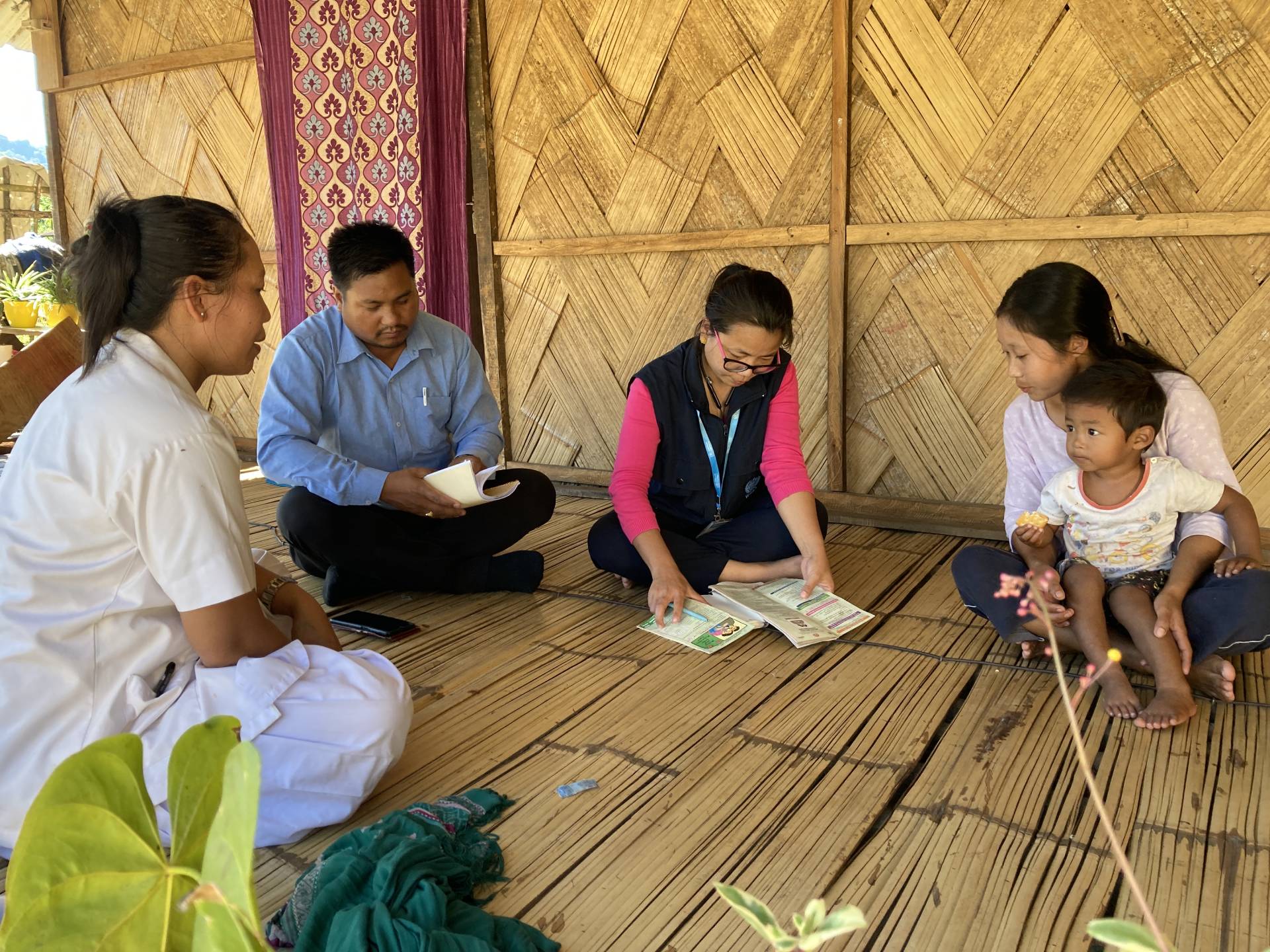 The WHO National Public Health Support Network (NPSN) team from Namsai supports auxiliary nurse midwife Ms Sincha Tikhak (in white) review Ms Hamnon Mossang’s son Khimthoi’s (born 24 April 2021) immunization card in their home in the remote Lungpang village in Changlong district, Arunachal Pradesh, India. WHO NSPN provides technical and monitoring support for routine immunization and vaccine-preventable diseases to the Government of India with special focus on strengthening services in hard-to-reach areas. (Photo: © WHO India / Sanchita Sharma)