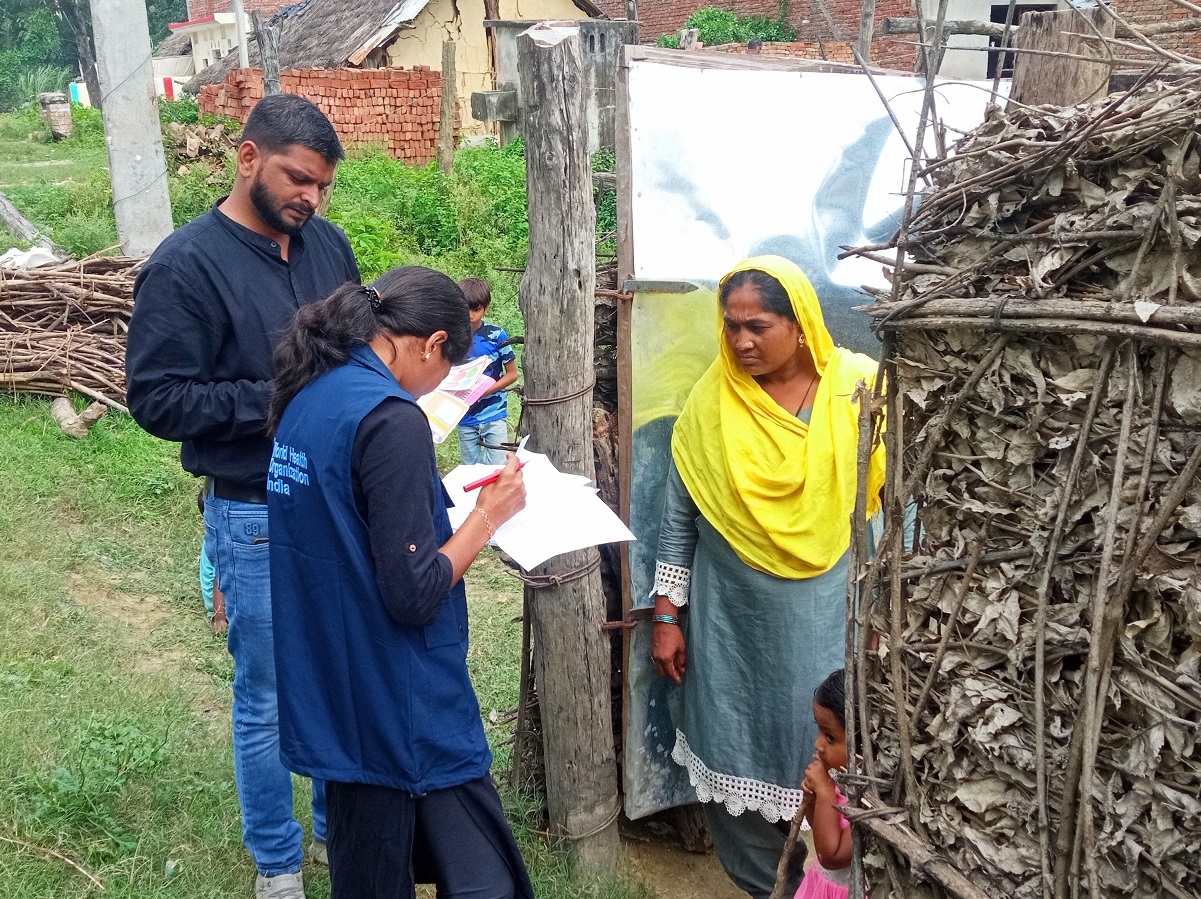 A WHO field team conducting active case search (ACS) during a fever with rash outbreak in Bardiya village, Mihinpurwa block in Bahraich district. Quality ACS helps in identifying clustering of cases for timely intervention to stop outbreaks. The WHO-National Public Health Support Network assists the government in capacity building, monitoring activities, ensuring timely interventions, planning vaccinations, and maintaining optimal disease surveillance. (Photo: Poonam / © WHO India)