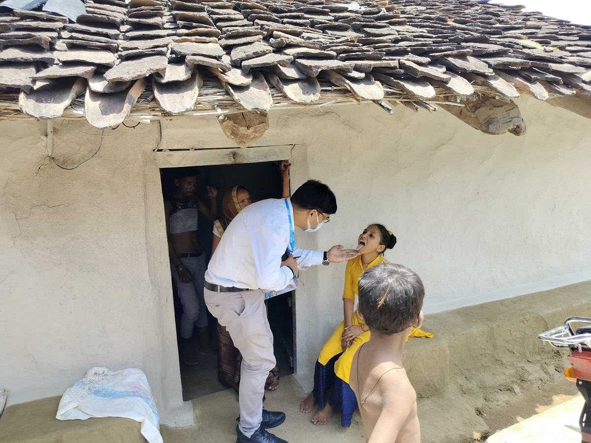 A WHO-National Public Health Support Network (NPSN) officer verifying a suspected diphtheria case in Shivrampur block in Chitrakoot district to identify new cases and validate the immunization status of children. WHO-NPSN teams support the government in vaccine-preventable disease surveillance to track suspected diphtheria cases, timely initiation of antibiotic prophylaxis for close contacts, and vaccination of unimmunized children in the community. (Photo: Than Singh / © WHO India)