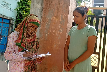 ASHA (community health volunteer) Ms Mamta Devi conducting house-to-house survey to record the vaccination status of children during Intensified Mission Indradhanush (IMI 5.0) in Urban Primary Health Centre Ward 46, Jaipur Urban. WHO National Public Health Support Network (NPSN) provided capacity-building support to health department’s frontline workforce to identify and vaccinate all unvaccinated and under-vaccinated children under the age of five years. (Photo: Seema Gurjar / © WHO India)