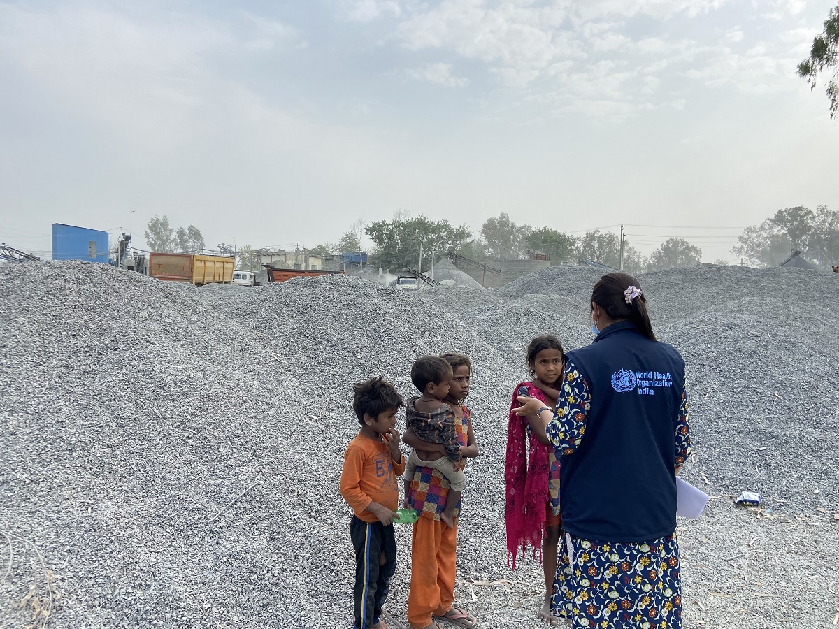 A WHO surveillance medical officer visits a high-risk stone crusher site in Baragaon, Jhansi district, to monitor the polio vaccination status of children living with their parents around the site. The WHO-National Public Health Support Network assists the government in capacity building, monitoring activities, ensuring timely interventions, planning vaccinations, and maintaining optimal disease surveillance. (Photo: Raman Lal /© WHO India)