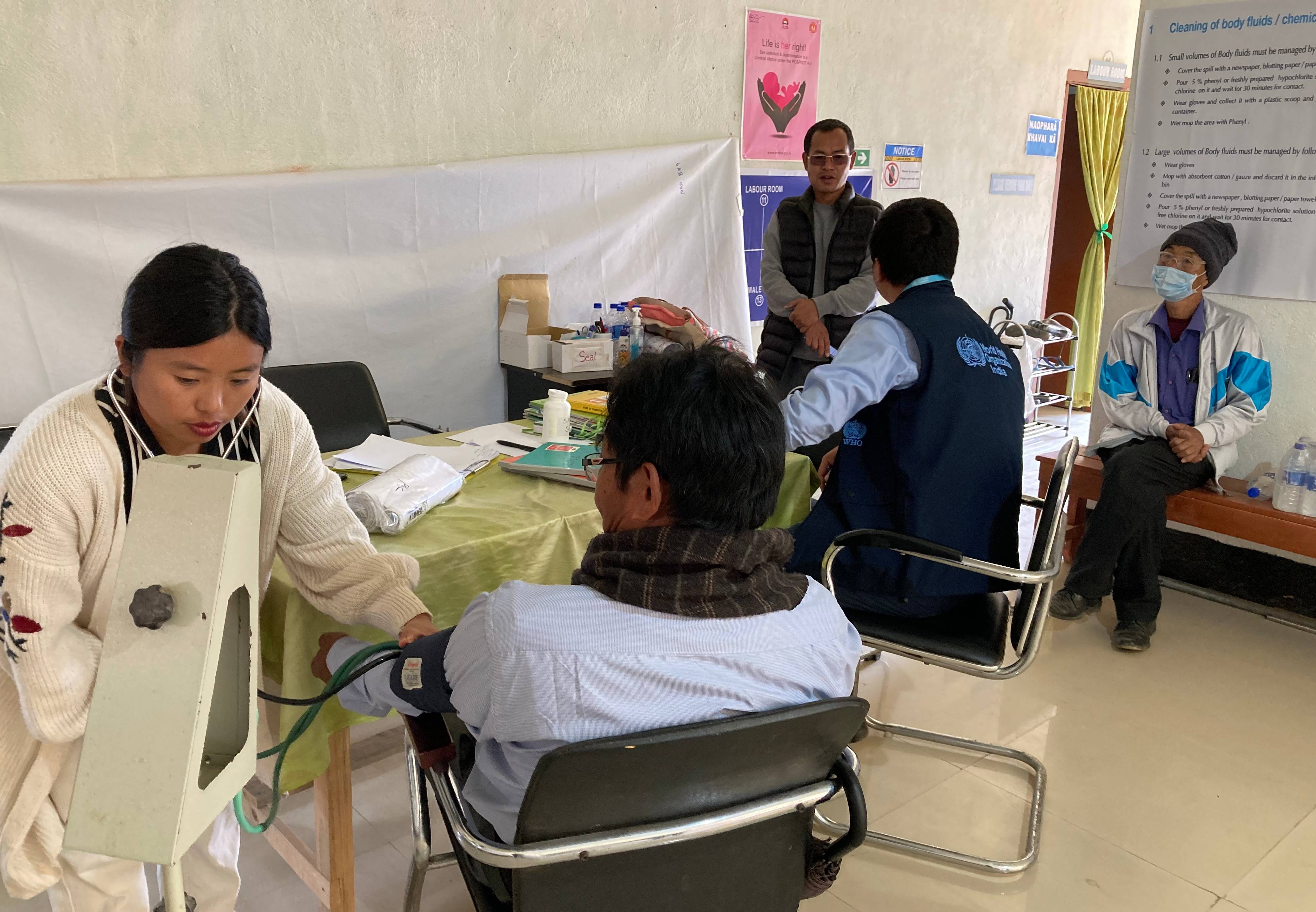 An auxiliary nurse midwife monitors the blood pressure of a patient at Primary Health Centre Phungyar in the Kamjong district of Manipur. India aims to put 75 million people on standard care for hypertension and diabetes under India Hypertension Control Initiative by 2025. Uncontrolled blood pressure is one of the main risk factors for cardiovascular diseases, which are responsible for one-third of all deaths in India. (Photo: Sanchita Sharma / © WHO India)