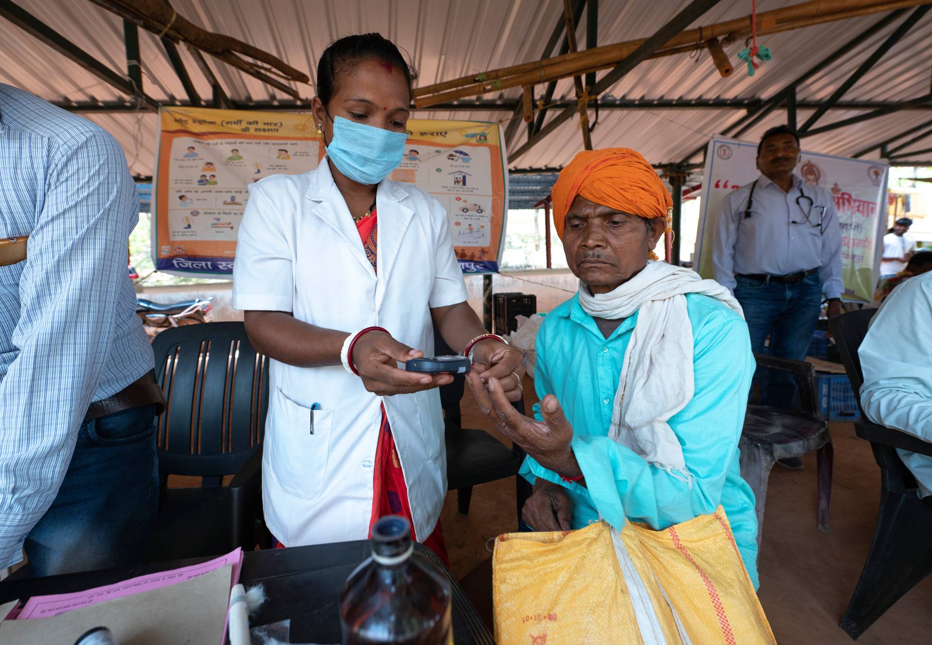 A visitor to a haat bazaar (rural market) in the Narayanpur district of Chhattisgarh gets screened for diabetes under India’s comprehensive primary health care services. The country aims to put 75 million people on standard care for diabetes and hypertension by 2025. Diabetes and hypertension are a leading risk factors for #noncommunicable diseases, such as heart disease, kidney failure, and stroke, among others. #WorldDiabetesDay. (Photo: Rajiv Solanki / © WHO India)