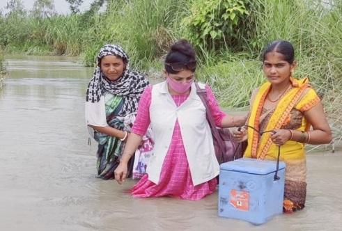Auxiliary nurse midwife Jeetendra Kaur (centre) and ASHAs Kiran Devi and Savita Rani carrying vaccines for the first round of Intensified Mission Indradhanush 5.0 (IMI 5.0) in the flooded Rahul Nagar Majdoori Basti village in Puranpur. On August 7, India launched the first of three rounds of IMI 5.0 to identify and vaccinate all unvaccinated and under-vaccinated children under the age of five years. (Photo: © WHO India)