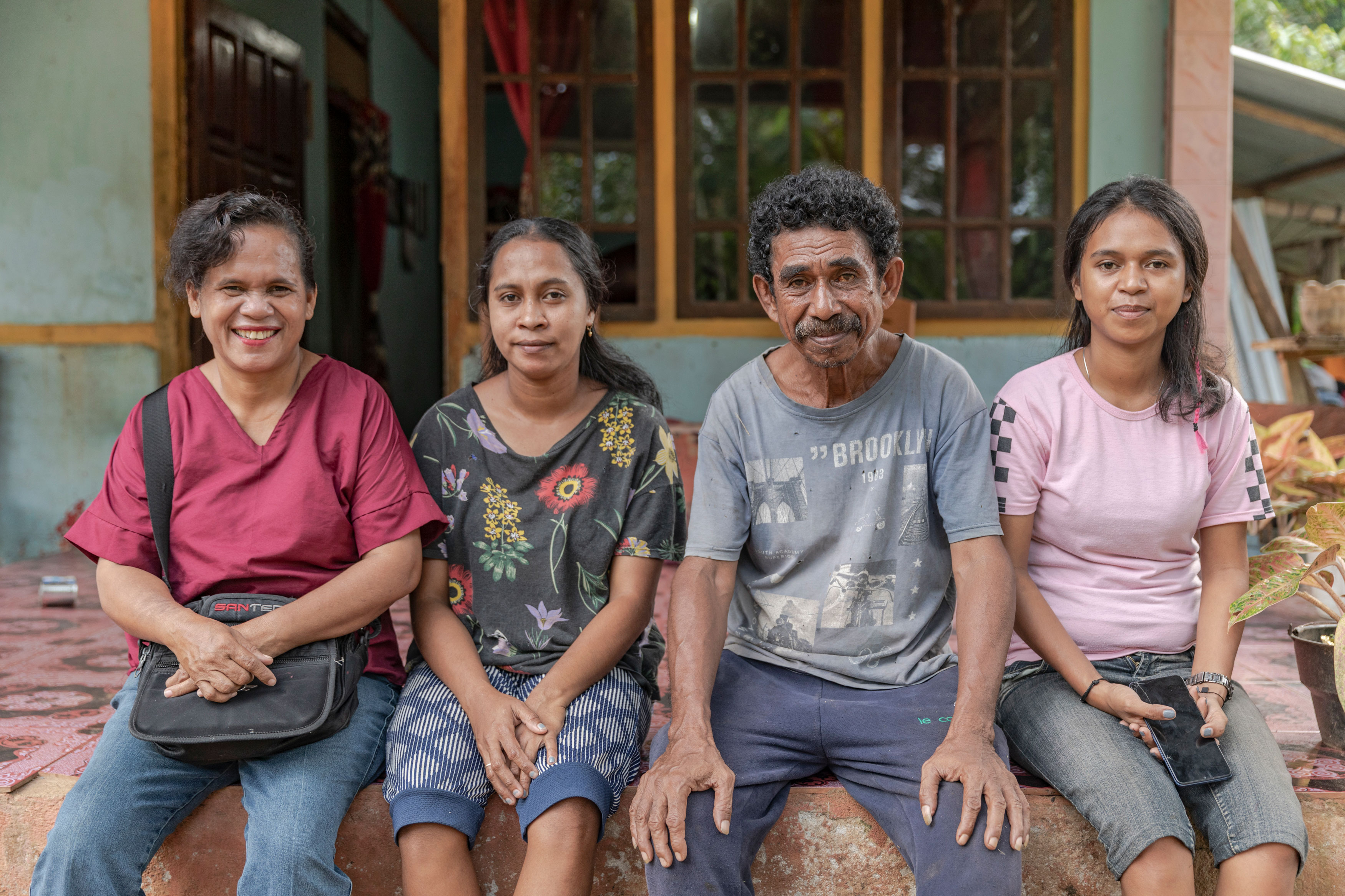 Pitony adalah seorang petani di Inamosol, Kabupaten Seram Barat, yang memiliki tujuh anak dan delapan cucu. Ia tinggal bersama istrinya, lima anak, satu menantu, dan tiga cucu. Saat kampanye vaksinasi COVID-19 dimulai di desanya, Pitony secara aktif meyakinkan keluarga dan tetangganya untuk melakukan vaksinasi bersama. Ia juga sesepuh Honitetu, salah satu komunitas adat Seram. Dalam foto ini, Pitony duduk bersama keluarganya (kiri ke kanan): istri Au Latu Purissa (53), menantu Nonalfia S. Lessy (26), dan putri Ayu Sisilia Tebiary (20).