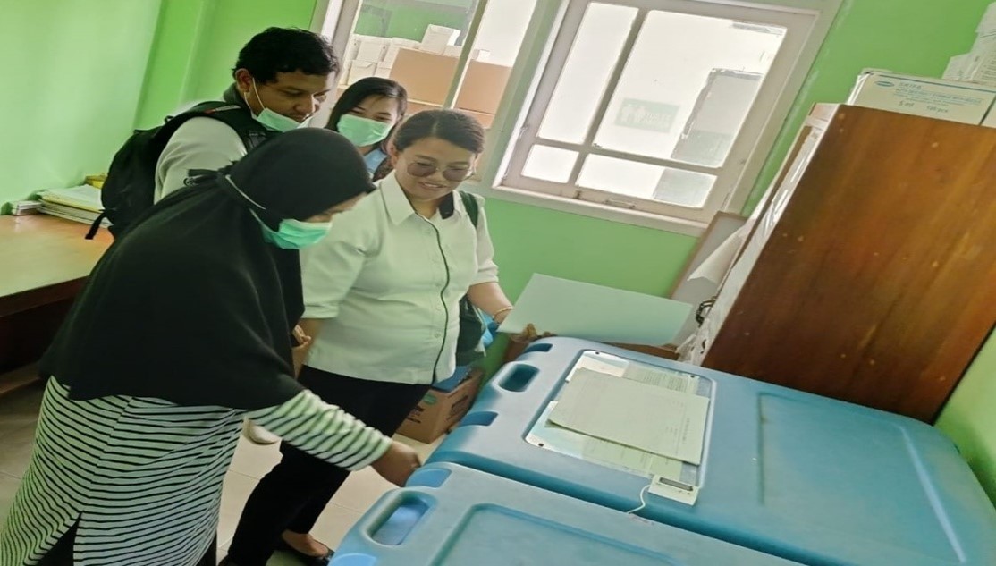 Peserta pelatihan mengamati pengelolaan rantai dingin di pusat kesehatan masyarakat (puskesmas) selama Praktik Kunjungan Lapangan (WHO/Rudi Gunawan)