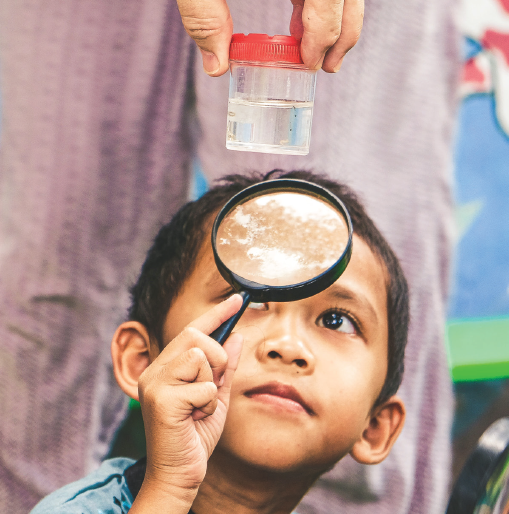 Caption: A child observes the mosquito larvae in Sekolah Alam Cokrodiningratan, 2018. Photo Credit: World Mosquito Programme Yogyakarta