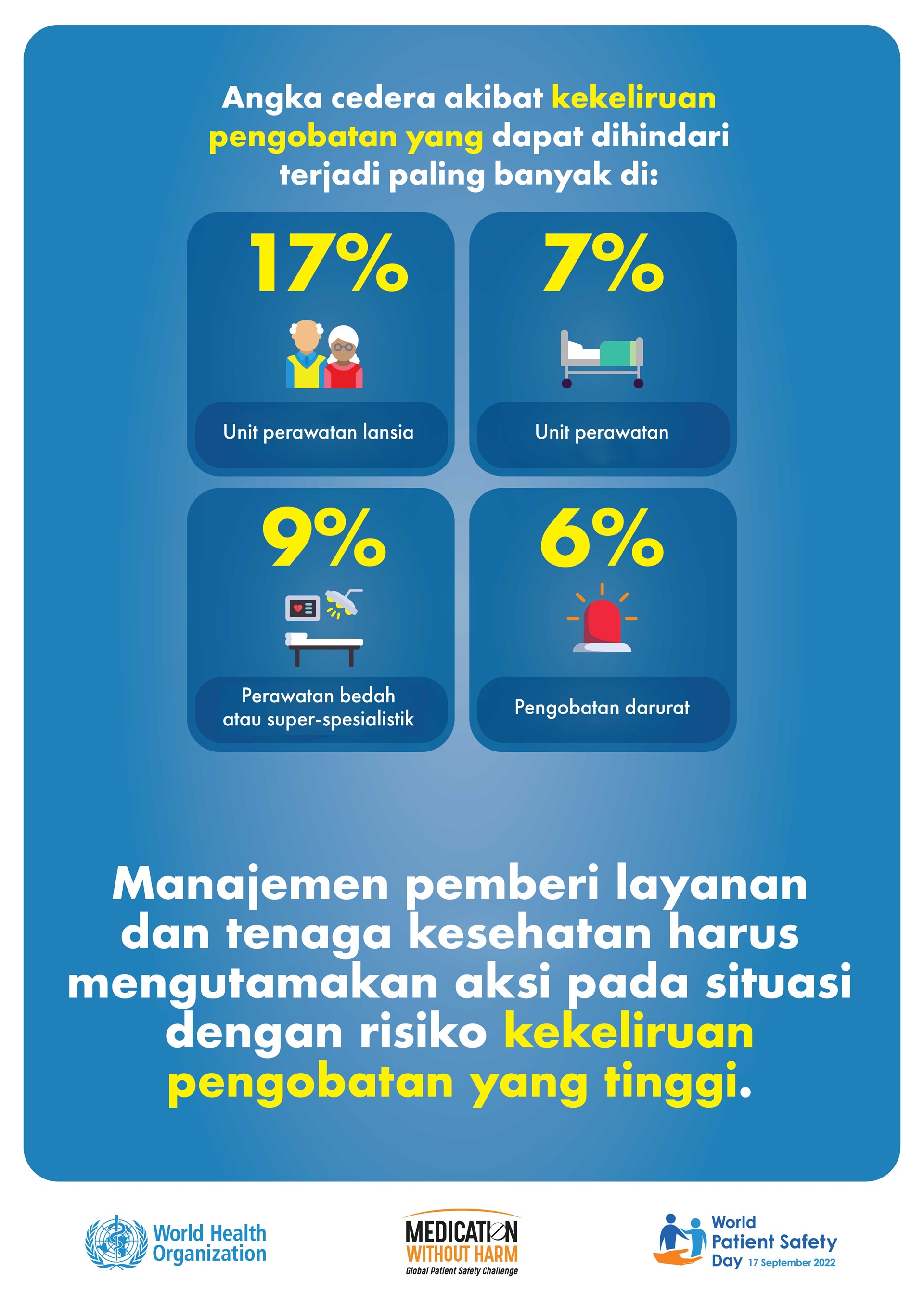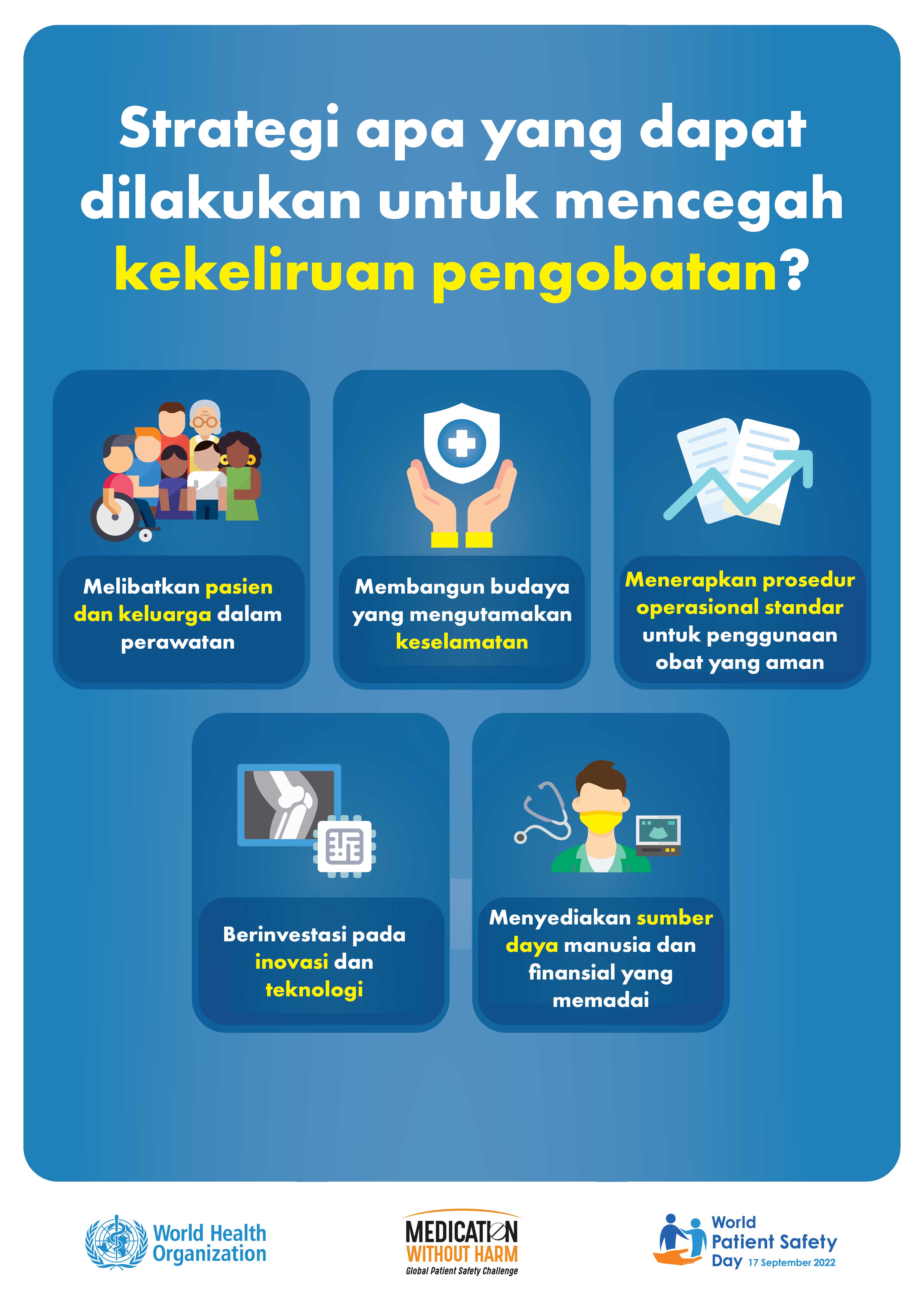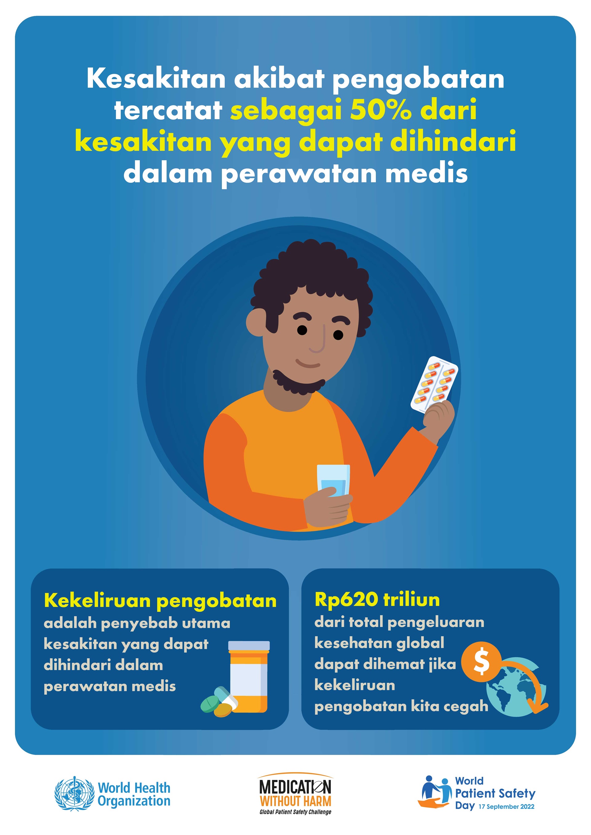 Melihat beban substansial ini beserta kompleksitas pencegahan dan pengurangan cedera akibat pengobatan, "Keamanan Obat" dipilih sebagai tema Hari Keselamatan Pasien Sedunia 2022.