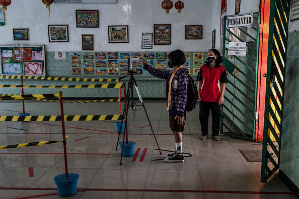 SOLO CITY, INDONESIA - A student wearing a face mask has her temperature checked before entering a class at the Warga elementary school on September 03, 2021 in Solo City, Central Java, Indonesia. Indonesia is easing restrictions gradually as cases fall in the island of Java and Bali. With the easing, some schools are allowed to hold limited face-to-face learning, with classes held at 50 percent of the usual capacity. (Photo by Ulet Ifansasti/Getty Images)