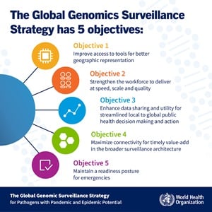 The Strategy provides a high-level unifying framework to leverage existing capacities, address barriers and strengthen the use of genomic surveillance in the detection, monitoring and response to public health threats. Genomic surveillance is part of the broader surveillance and laboratory system, and its implementation should reinforce end-to-end capacities including sample collection, diagnostics, data sharing and analysis. The strategy aims to facilitate the connectivity between different disease control programs and surveillance networks. This interoperability will strengthen the cross-cutting essential public health laboratory functions underpinning genomics holistically. The strategy articulates the overarching goal, objectives and strategic actions needed. These are dependent on commitments from countries, partners and WHO for their implementation.