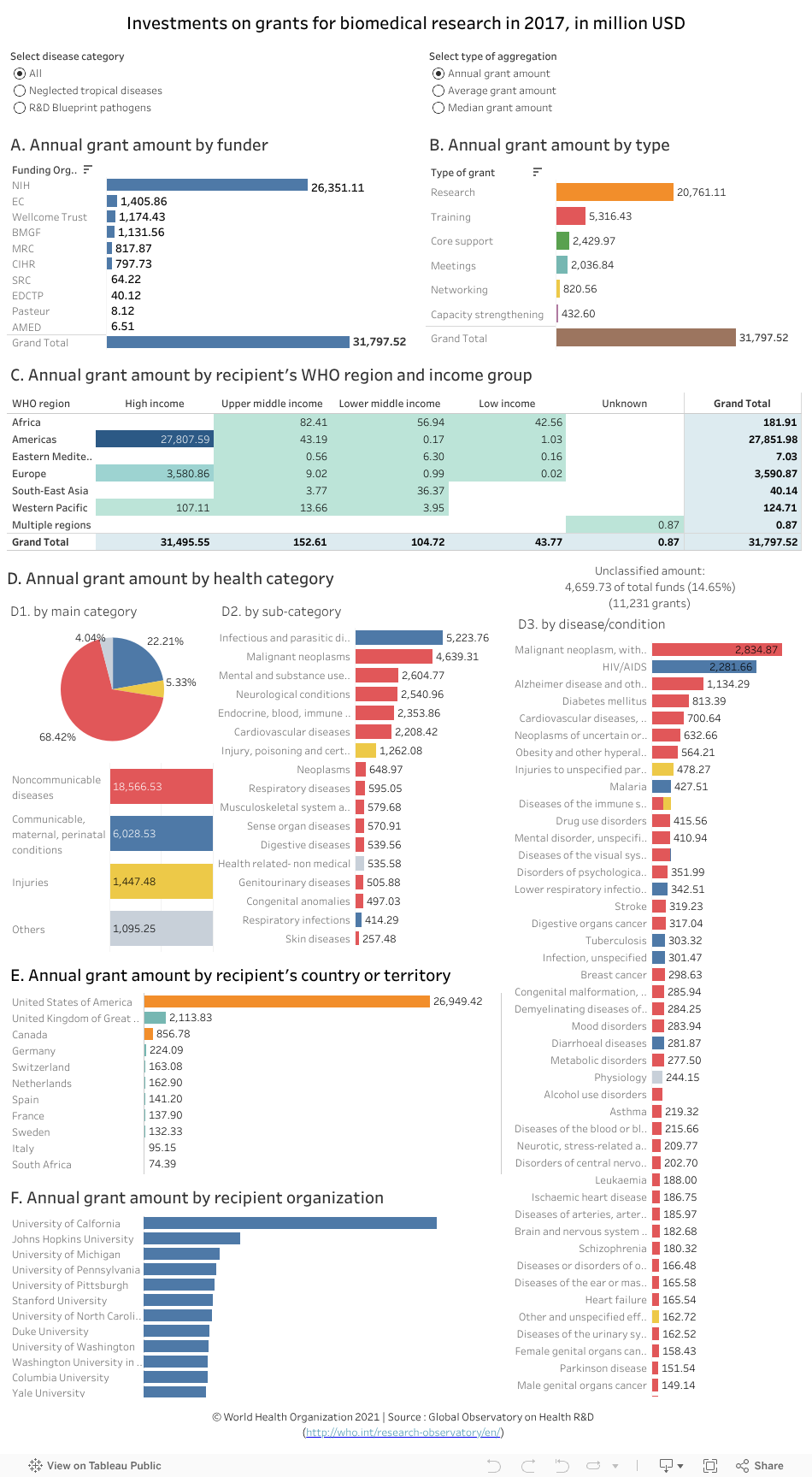 - The top three diseases among the WHO neglected tropical diseases to receive grants were dengue, leishmaniasis, and trachoma (receiving approx. US$ 0.06 billion, US$ 0.03 billion, and US$ 0.02 billion, respectively). (Select the “Neglected tropical diseases” button from the disease category options at the top of the visualization and then view chart D3.)