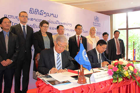 Regional Director Dr Shin Young-soo (left) and Health Minister of Lao PDR, Dr Bounkong Syhavong at the signing ceremony of the Country Cooperation Strategy