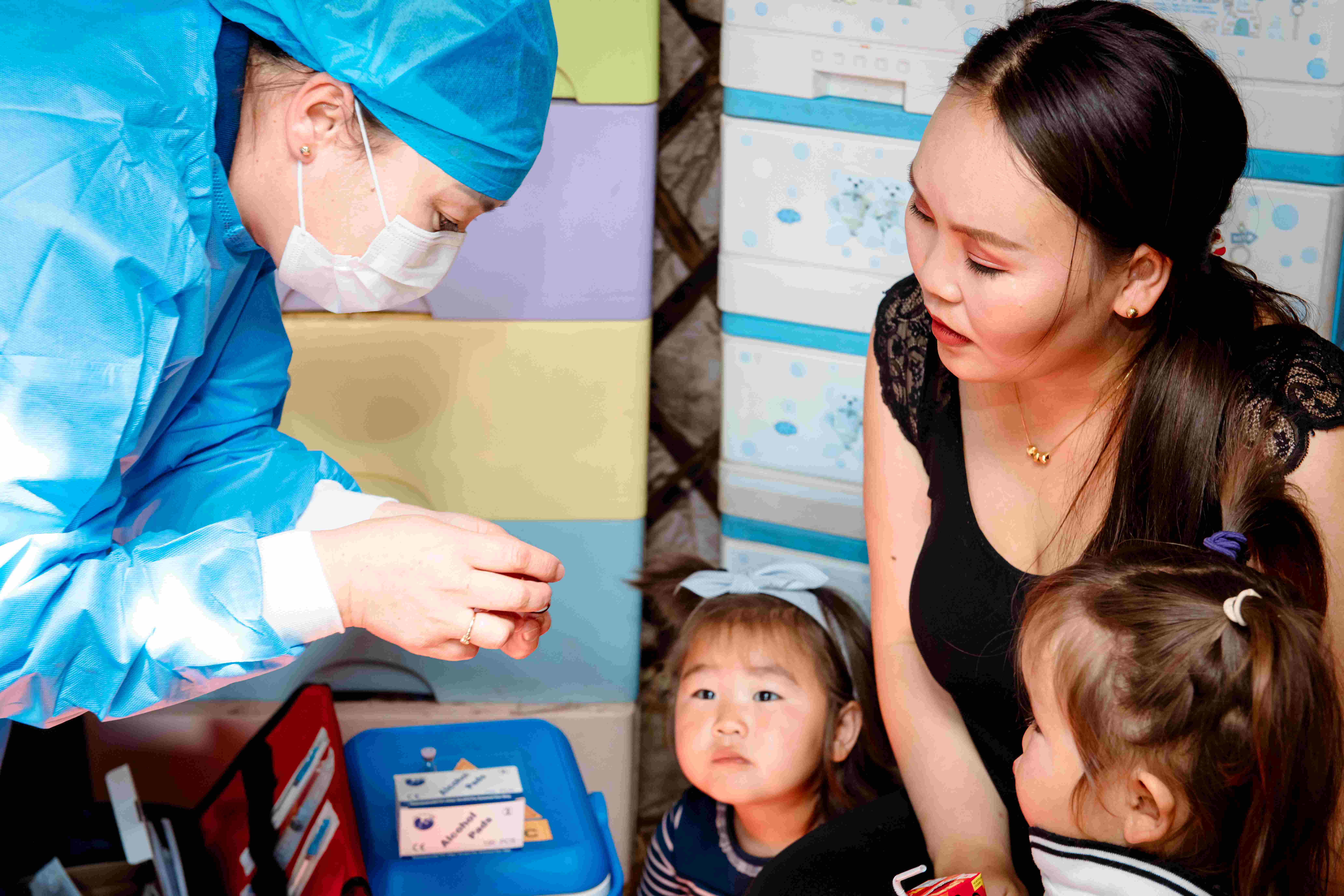 Говьсүмбэр аймгийн Энхтусдэм өрхийн эрүүл мэндийн төвийн эмч Агирмаа, сувилагч Бямбаа нар хүүхдэд товлолын вакциныг хийж байна. Зургийг: ДЭМБ