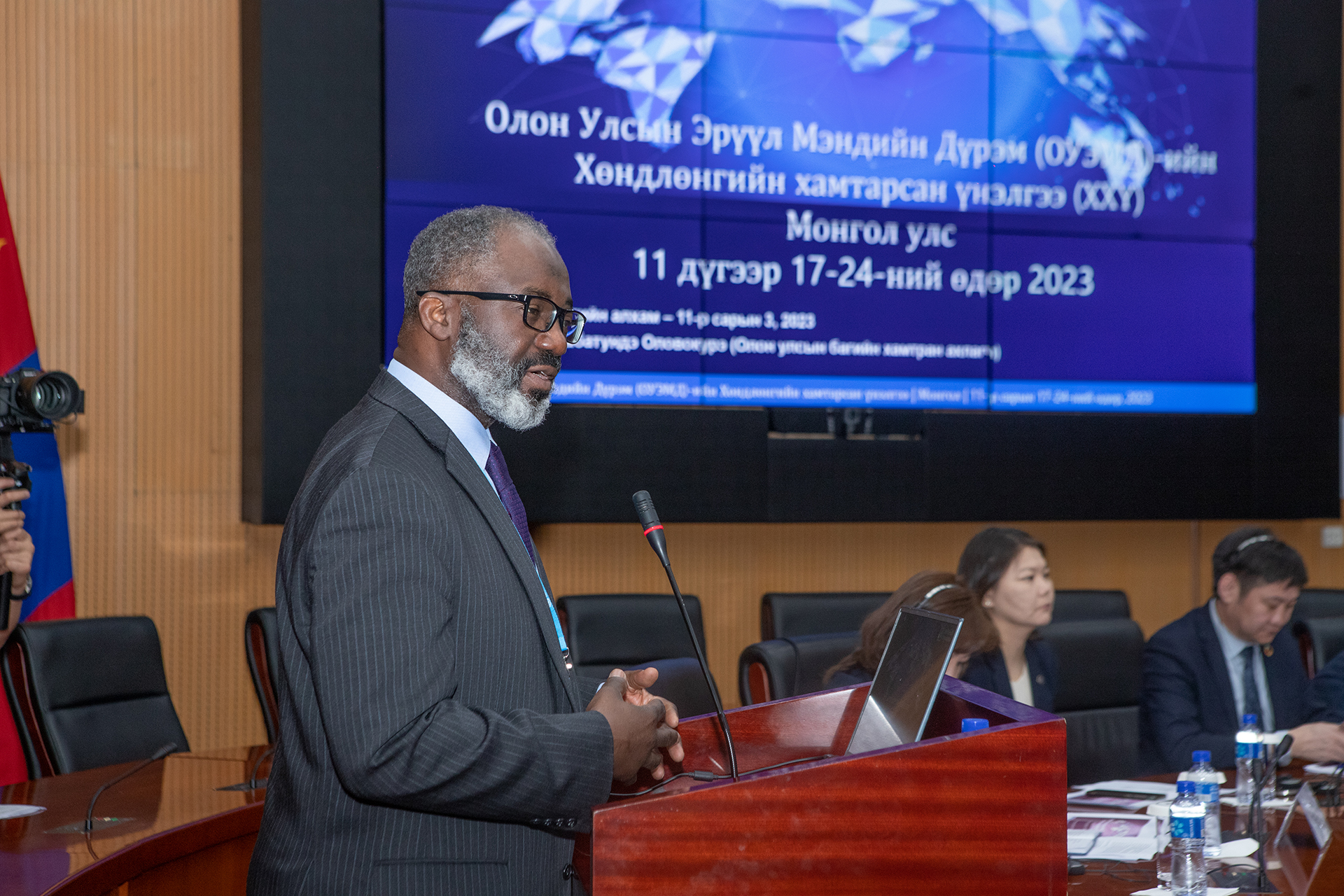 Next steps by Dr Babatunde Olowokure during “Feedback and closing session for Ministries, agencies, multisectoral stakeholders, and partners”, on 24 Nov 2023. Photo credit: WHO Mongolia