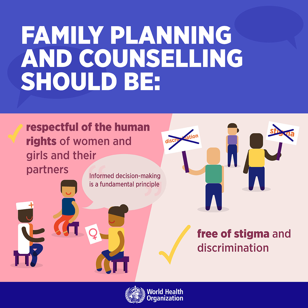 Family planning and counselling should be: respectful of the human rights and their partners; free of stigma and discrimination 8 July 2019 | graphics (infographic) WHO Team Sexual and Reproductive Health and Research (SRH)