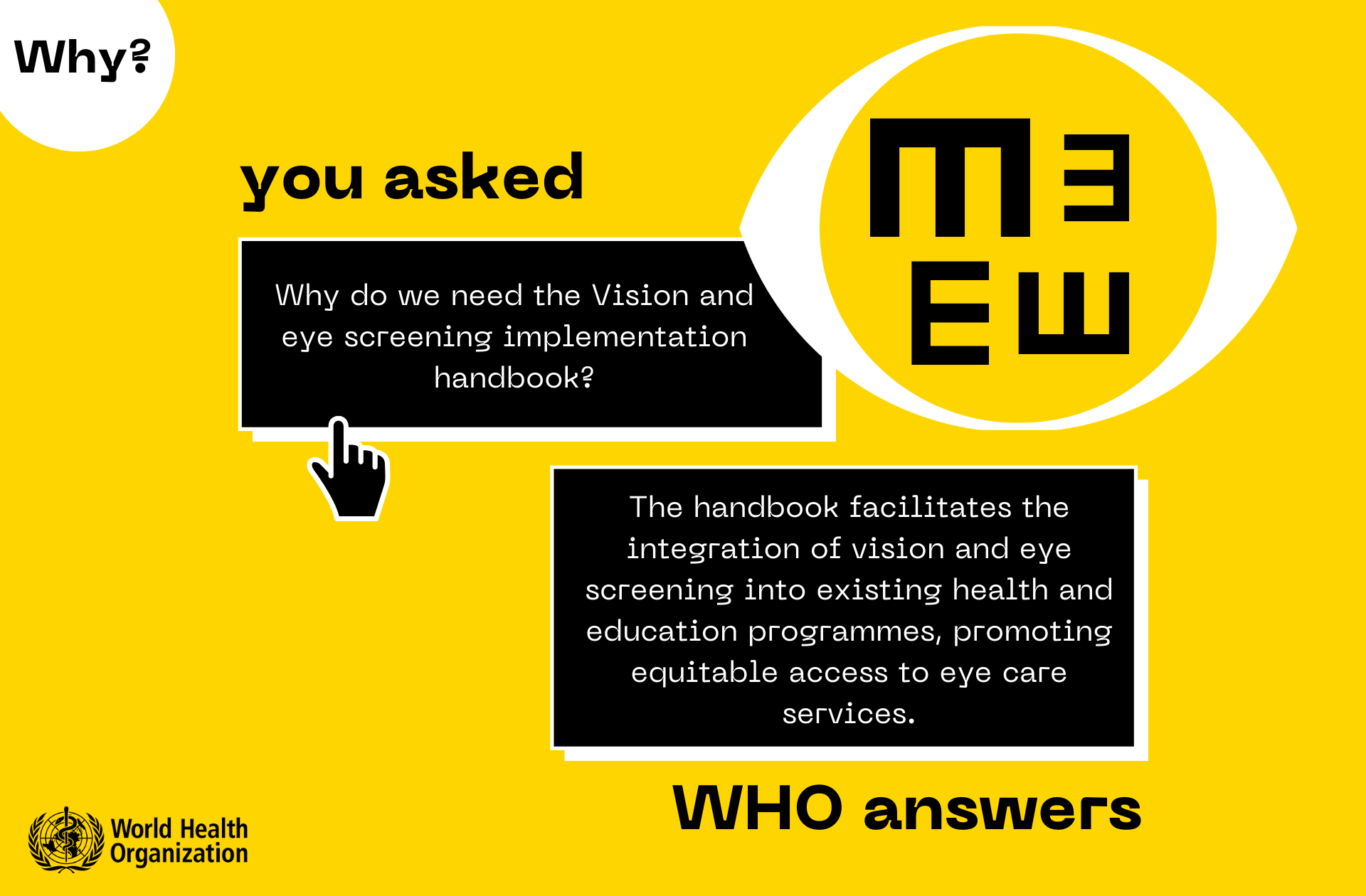 Why do we need the Vision and eye screening implementation handbook? 31 January 2023 | graphics (social media tile) WHO Team Noncommunicable Diseases, Rehabilitation and Disability (NCD), Sensory Functions, Disability and Rehabilitation (SDR)